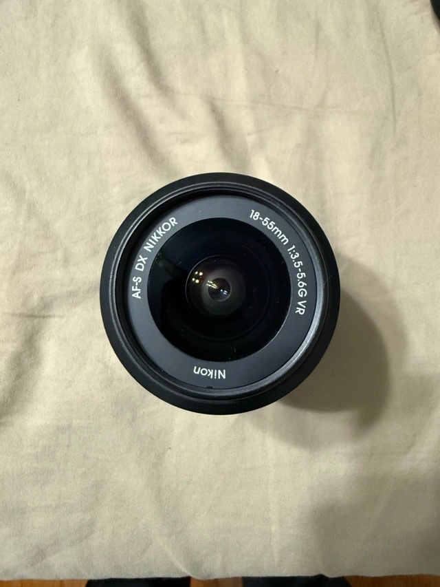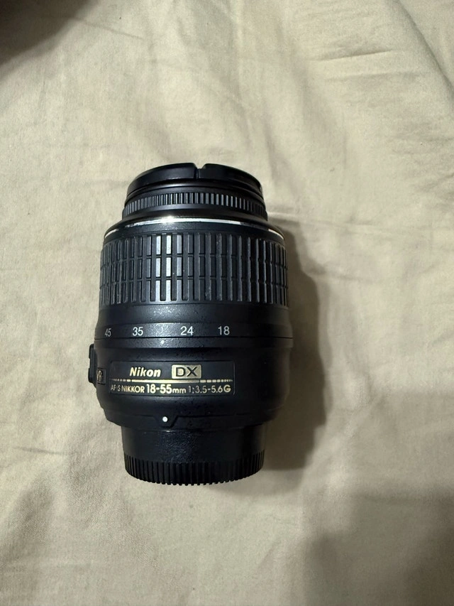 Standard Nikon 18-55mm DX VR zoom lens. Great lightweight everyday lens for Nikon crop-sensor DSLRs (D3xxx / D5xxx / D7xxx series). Includes: • Lens + front cap (as shown) Condition: Used, cosmetic wear. VR and autofocus work.