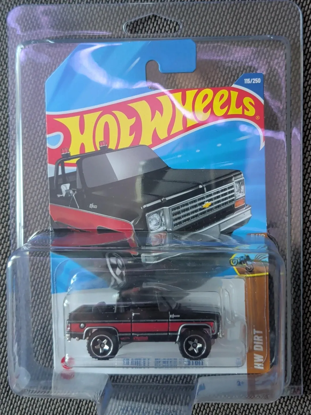 This is a 1978 Chevrolet Cheyenne C10 Hot Wheels die-cast model. It's part of the 2023 "HW Dirt" series, number 115 out of 250. The vehicle is black with red accents and comes in its original packaging.