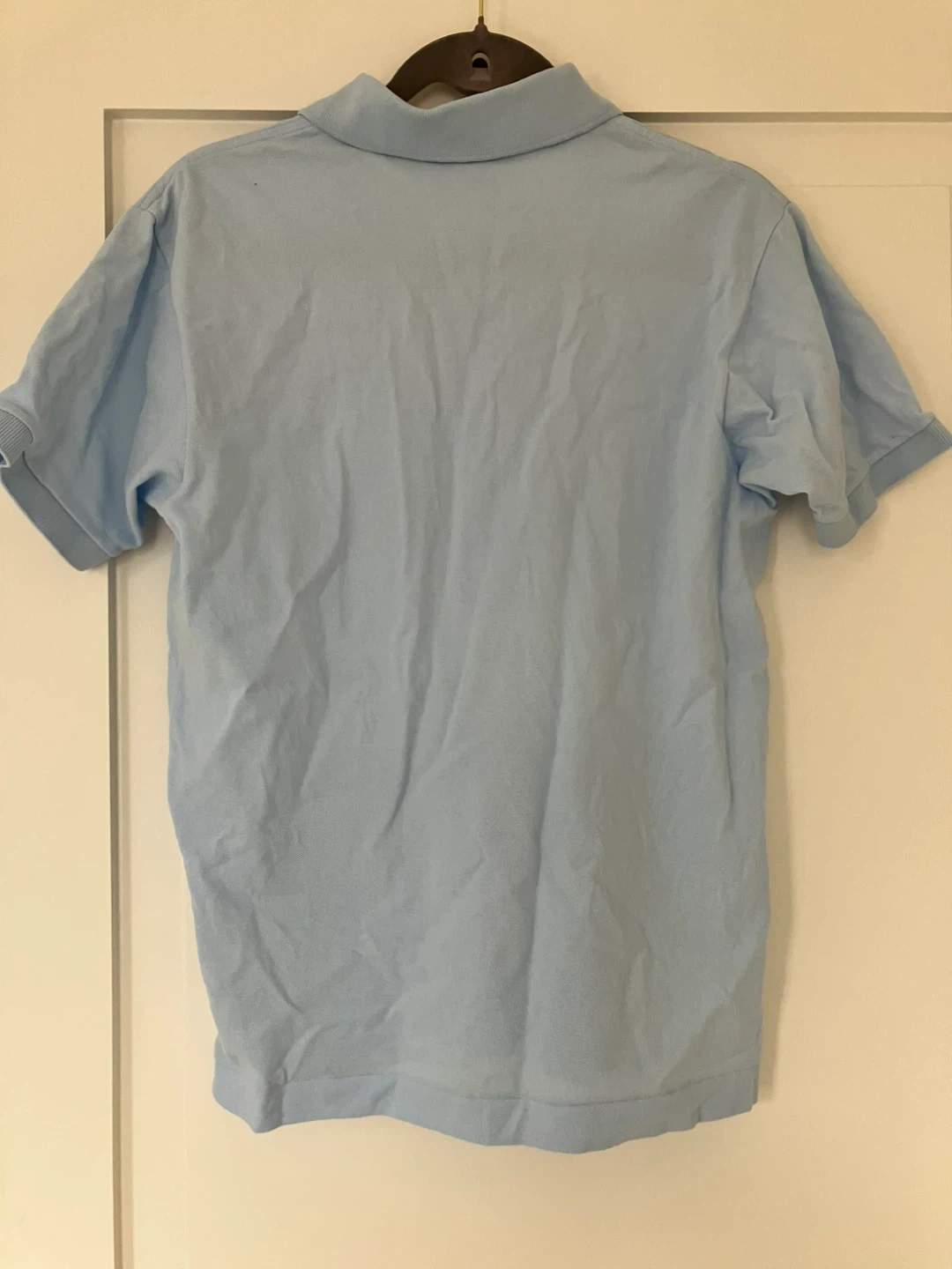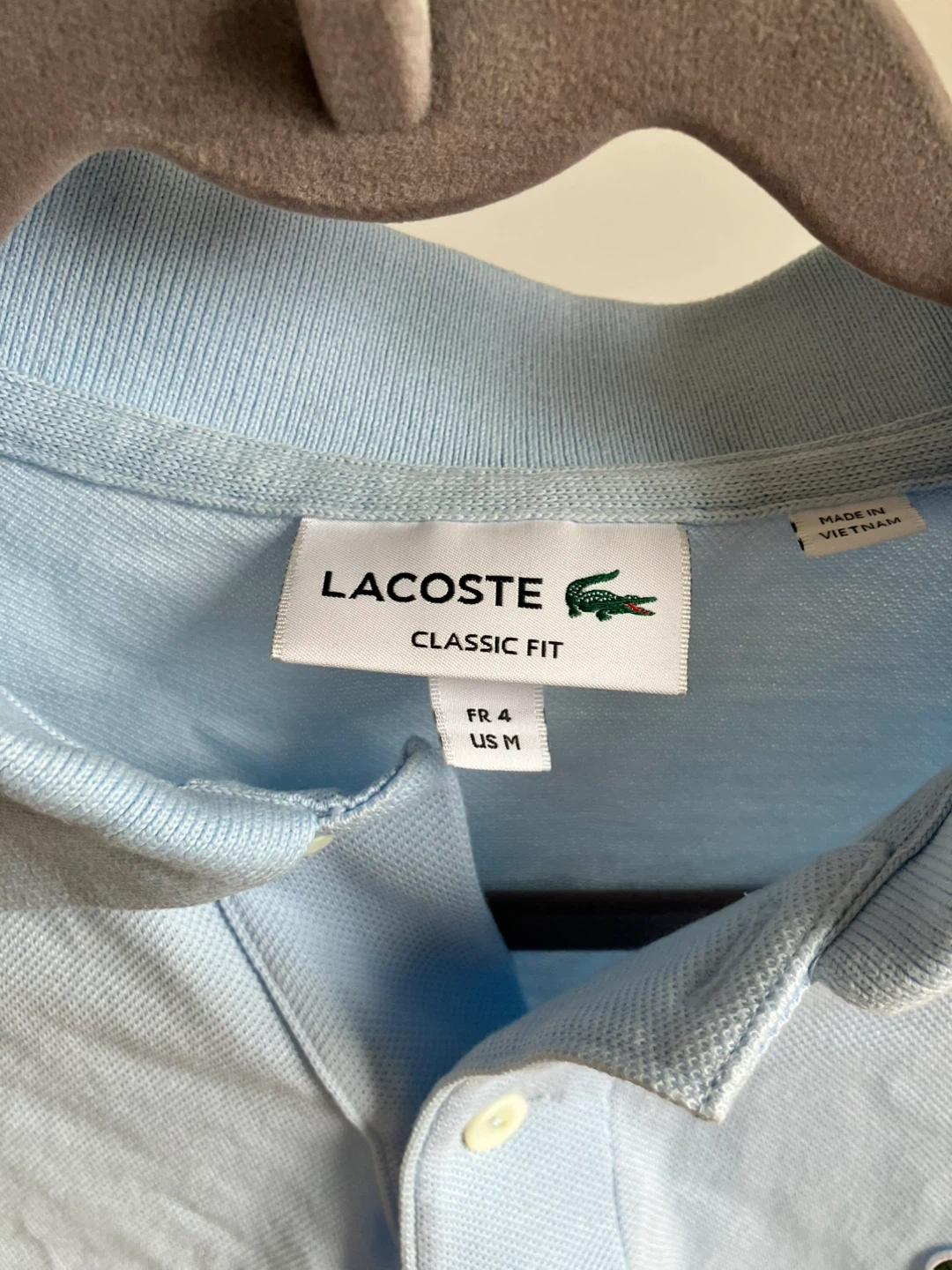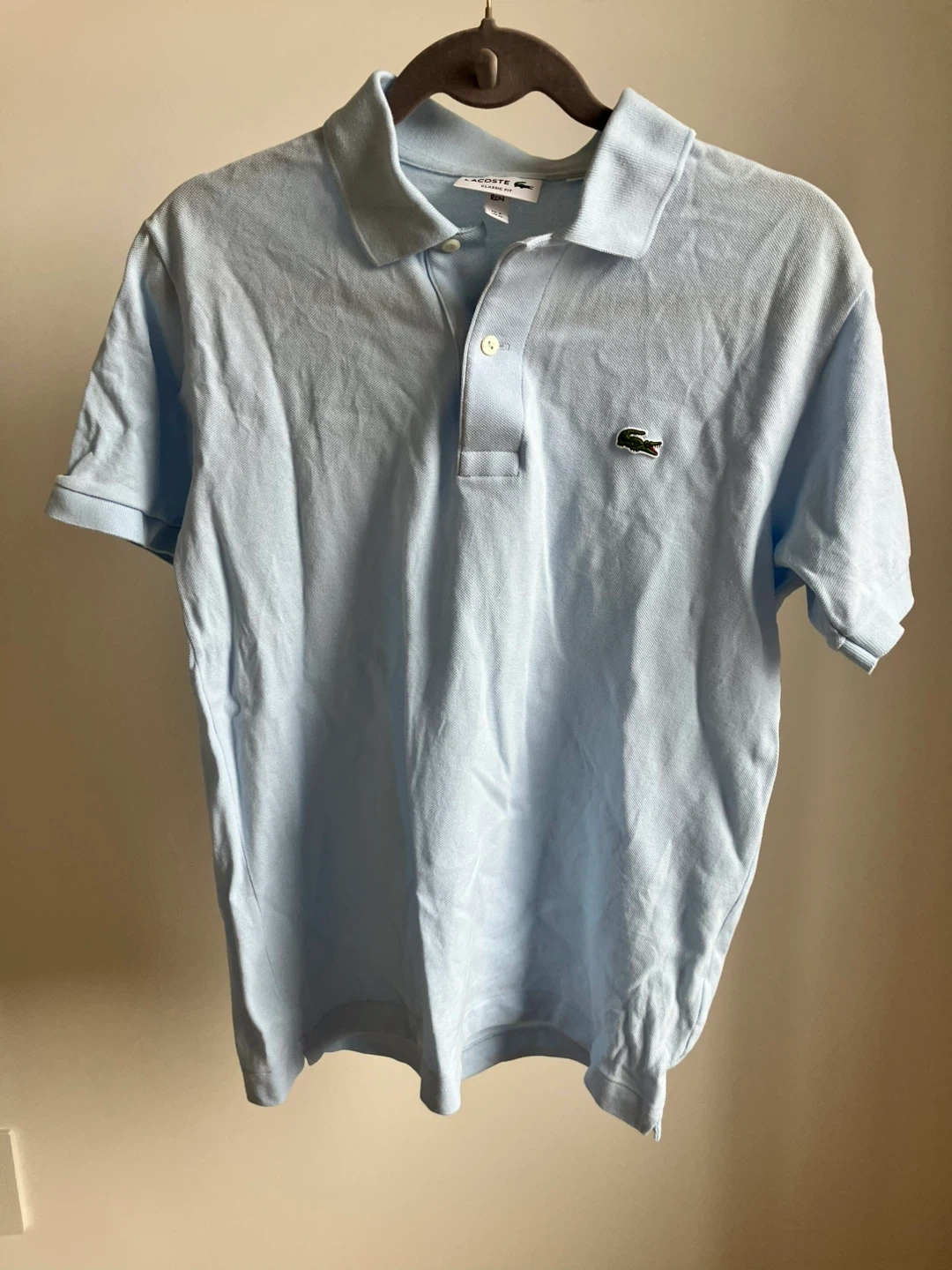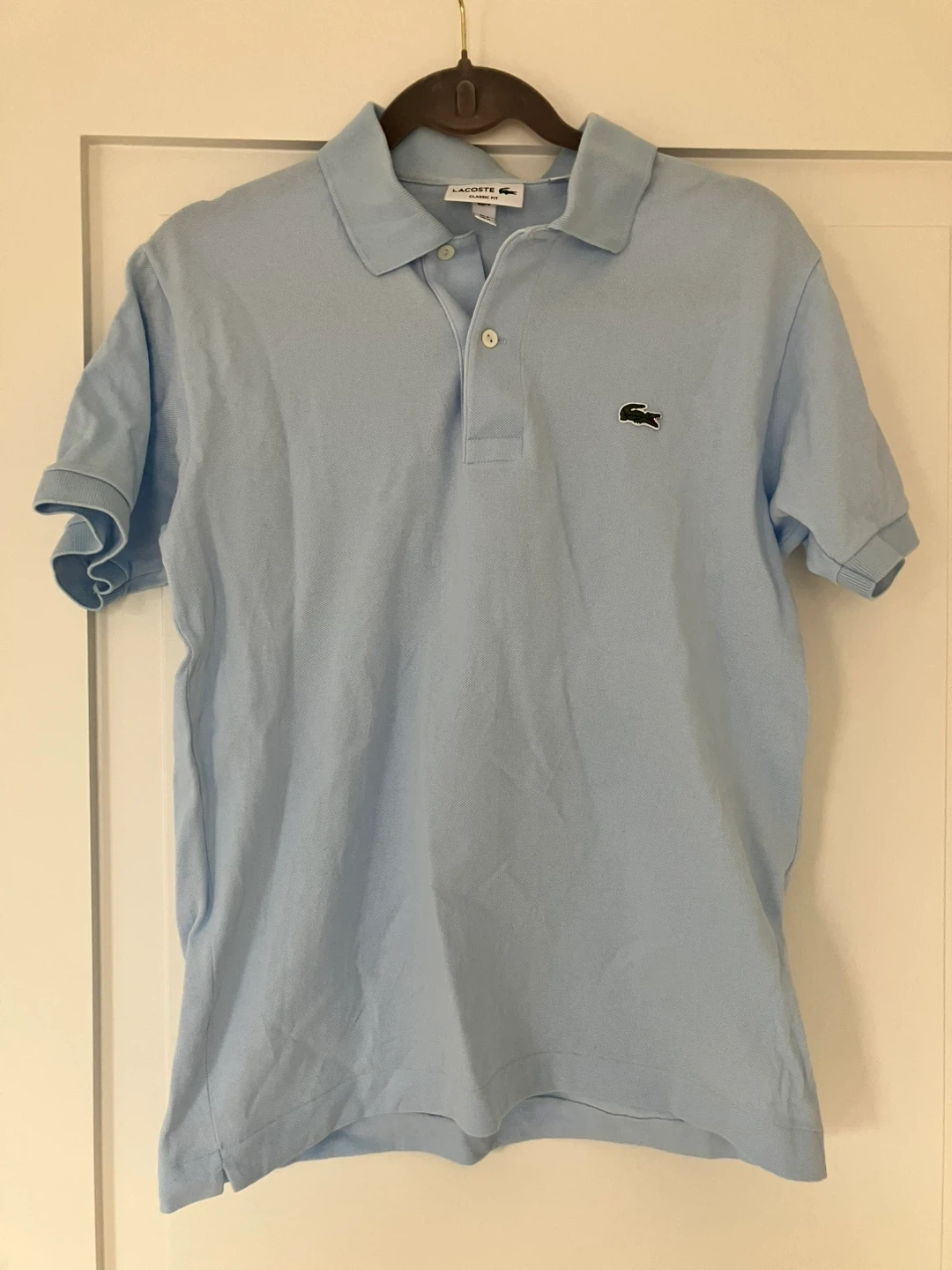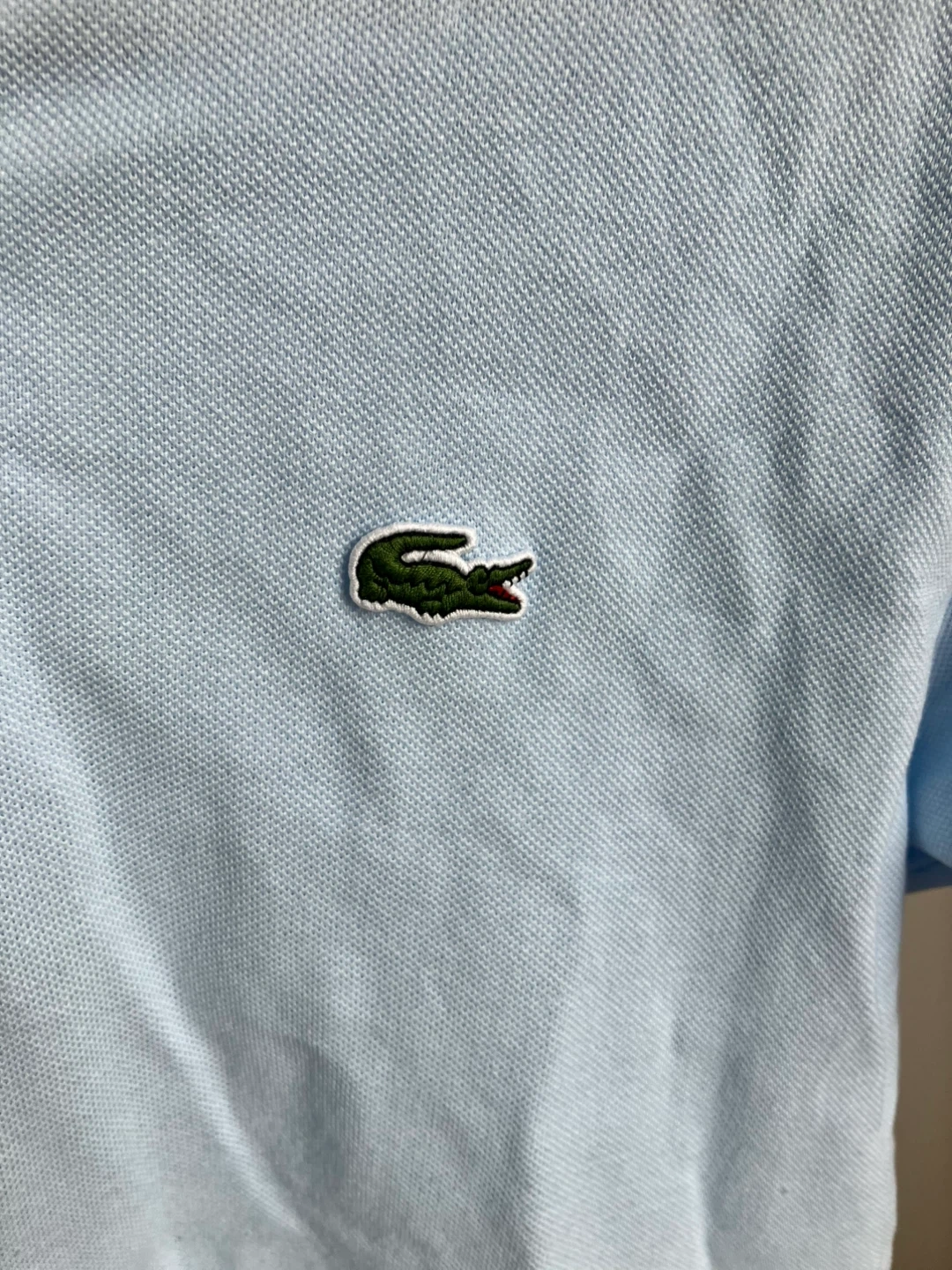 A classic light blue polo shirt by Lacoste, featuring their signature crocodile logo. It's a size US Medium, offering a comfortable fit. This shirt is made from breathable cotton, perfect for everyday wear. Never worn.
