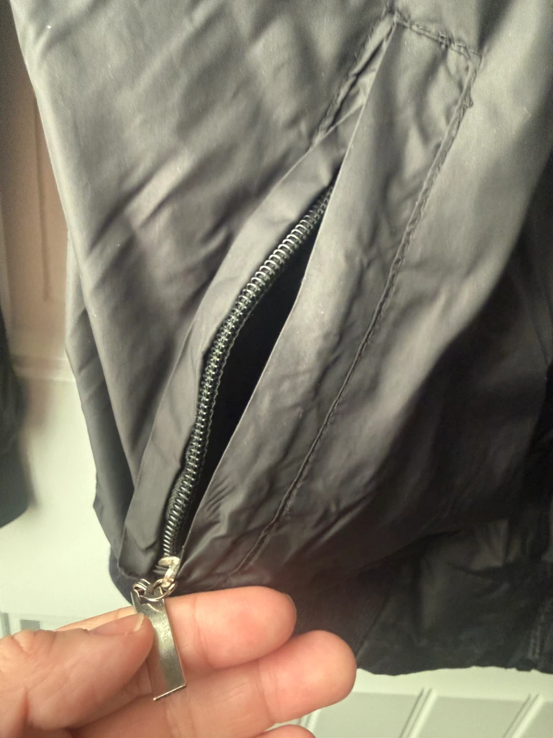 This black Silver Summer jacket features a grey hood and a sporty stripe design across the chest. It's a size medium, perfect for layering during cooler weather. The jacket has zippered pockets for convenience.