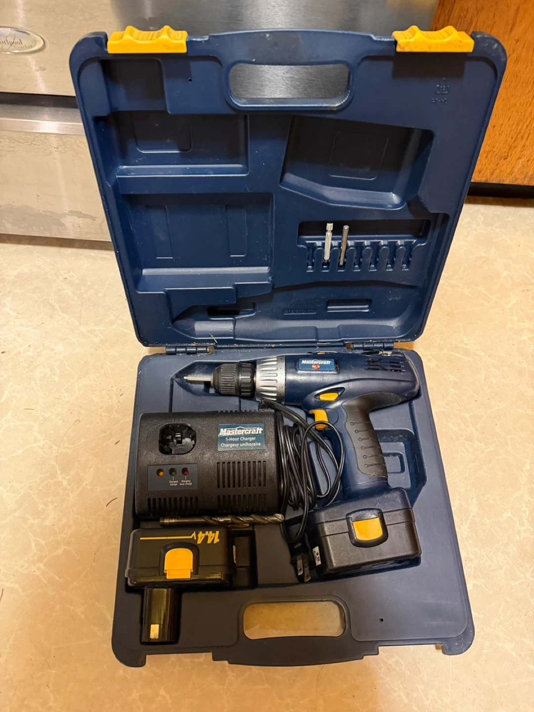 Mastercraft 14.4V cordless drill kit. It's a blue and silver drill with a black grip. Includes a "1 Hour Charger" and a 14.4V All stored in a blue Mastercraft carrying case.