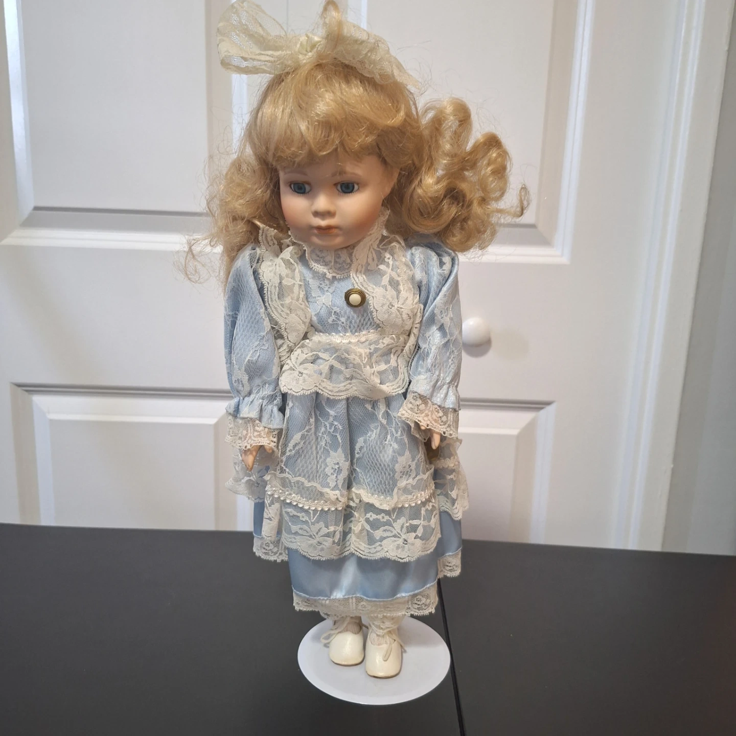 This is a lovely decorative porcelain doll wearing a blue and lace dress. It comes with a certificate of authenticity. The doll's intricate detailing makes it a beautiful display piece.