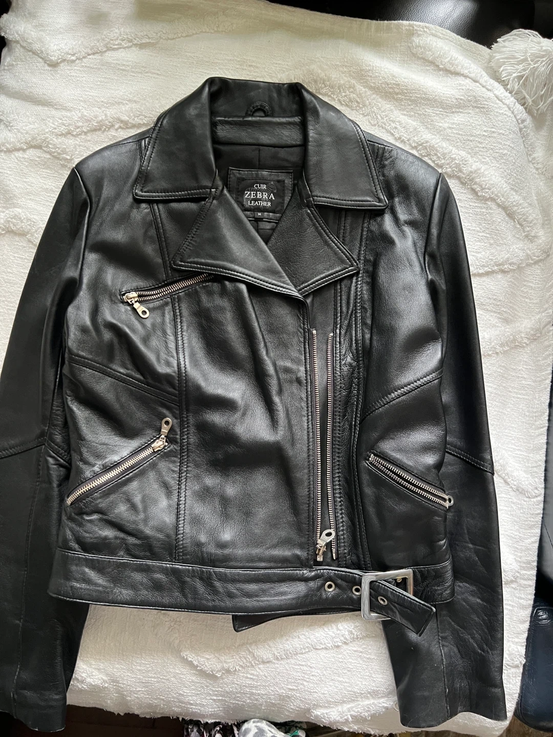 Classic black biker jacket from ZEBRA LEATHER. Made from genuine leather with silver hardware. Features zippered pockets and a buckled waist. Perfect for a stylish look!