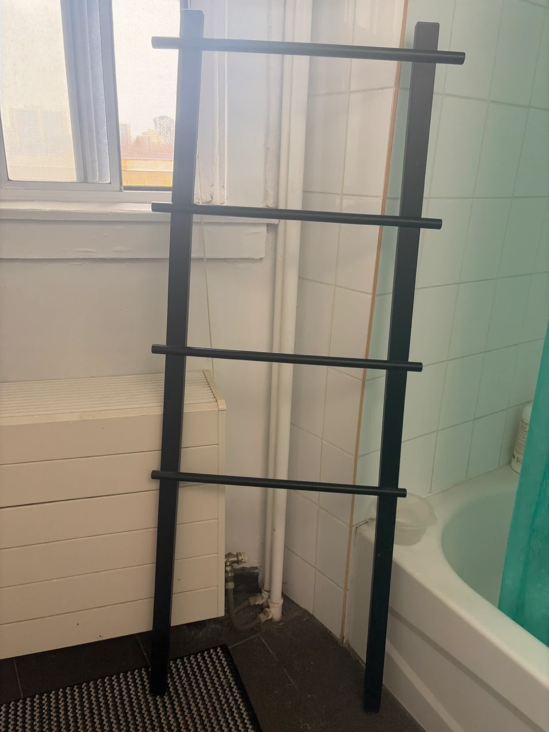 This black towel rack features a ladder design with four rungs. It's made of metal and is great for hanging towels or blankets. Its slim profile makes it a good fit for small bathrooms.