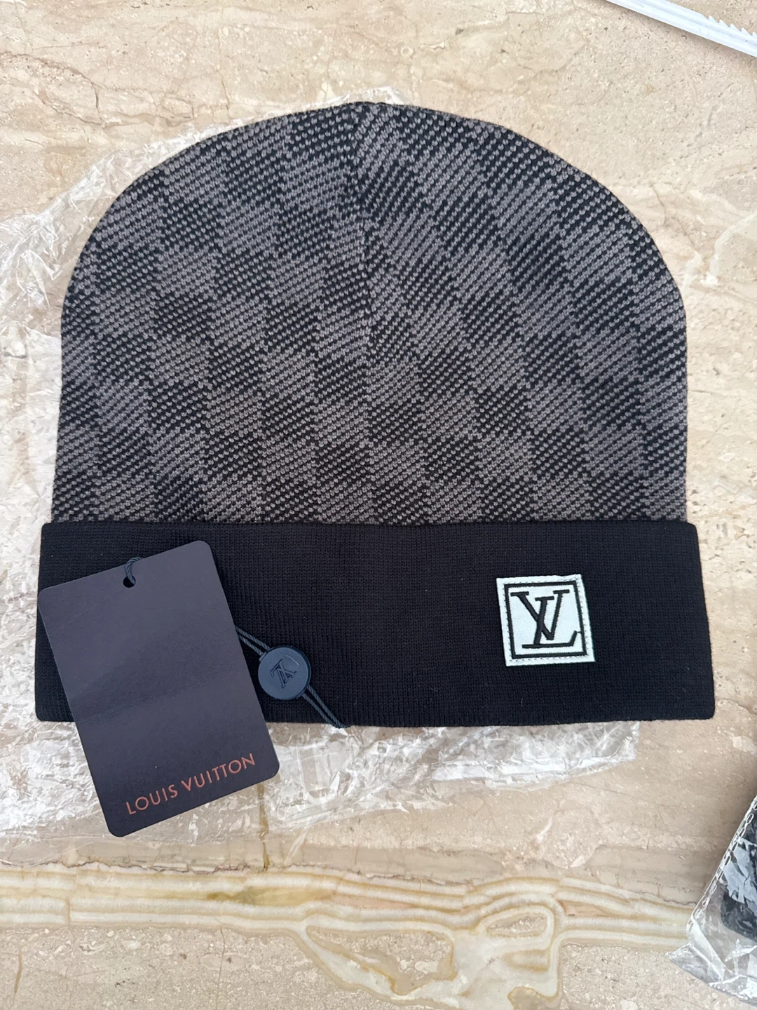 This is a Louis Vuitton beanie hat. It's a knit design in black and grey with a checkerboard pattern. The hat features a black ribbed cuff.