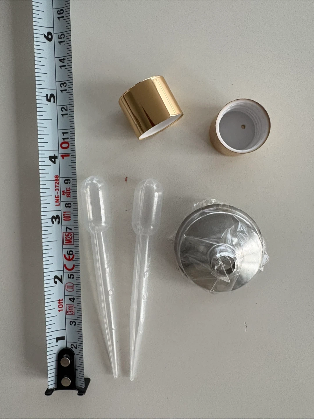 A large quantity of plastic pipette droppers and a few small metal and plastic funnels and metal screw-on caps for essential oils or small liquid transfers. These are great for DIY perfume or cosmetic crafting. All are new and unused.