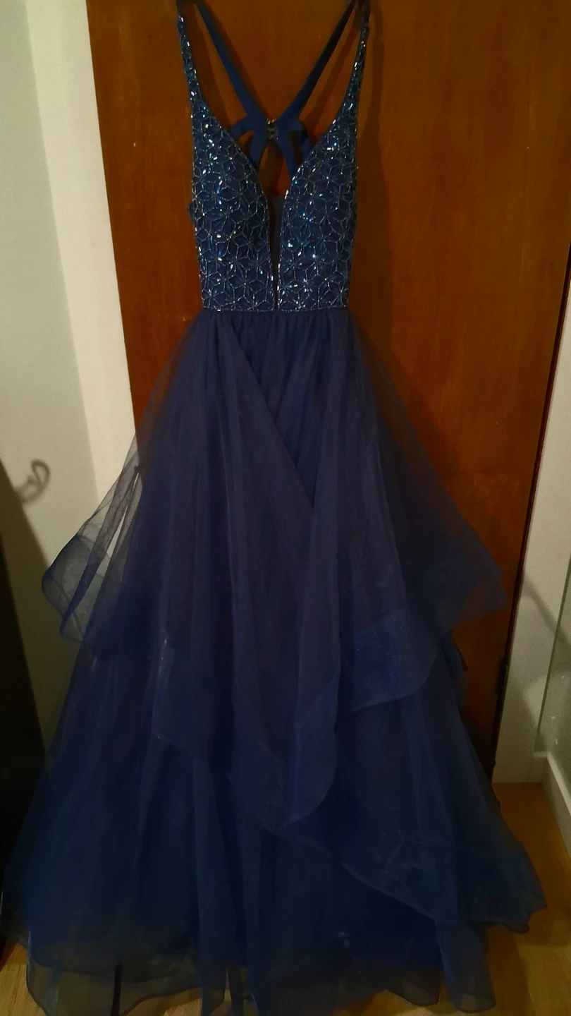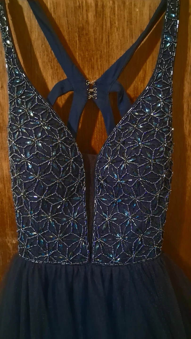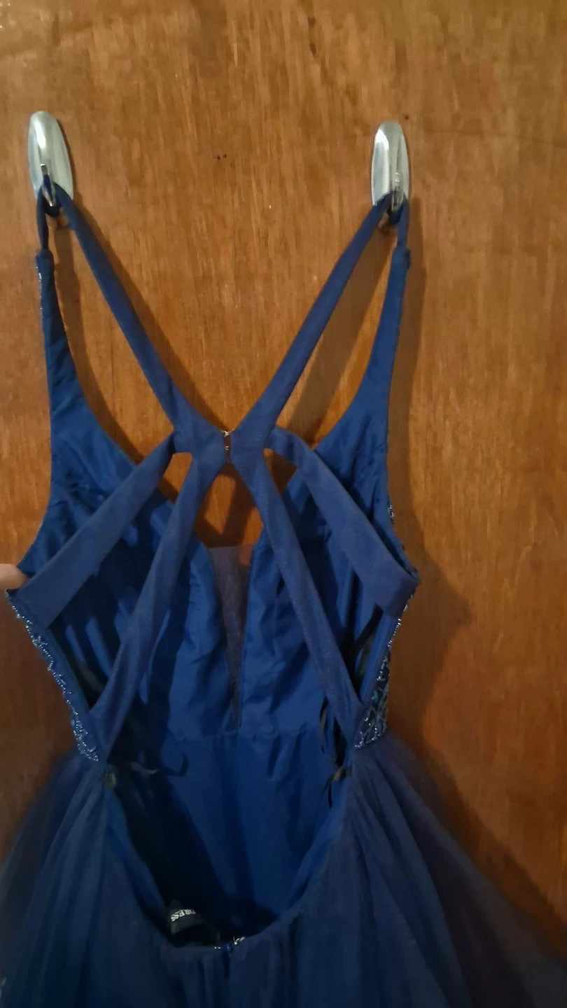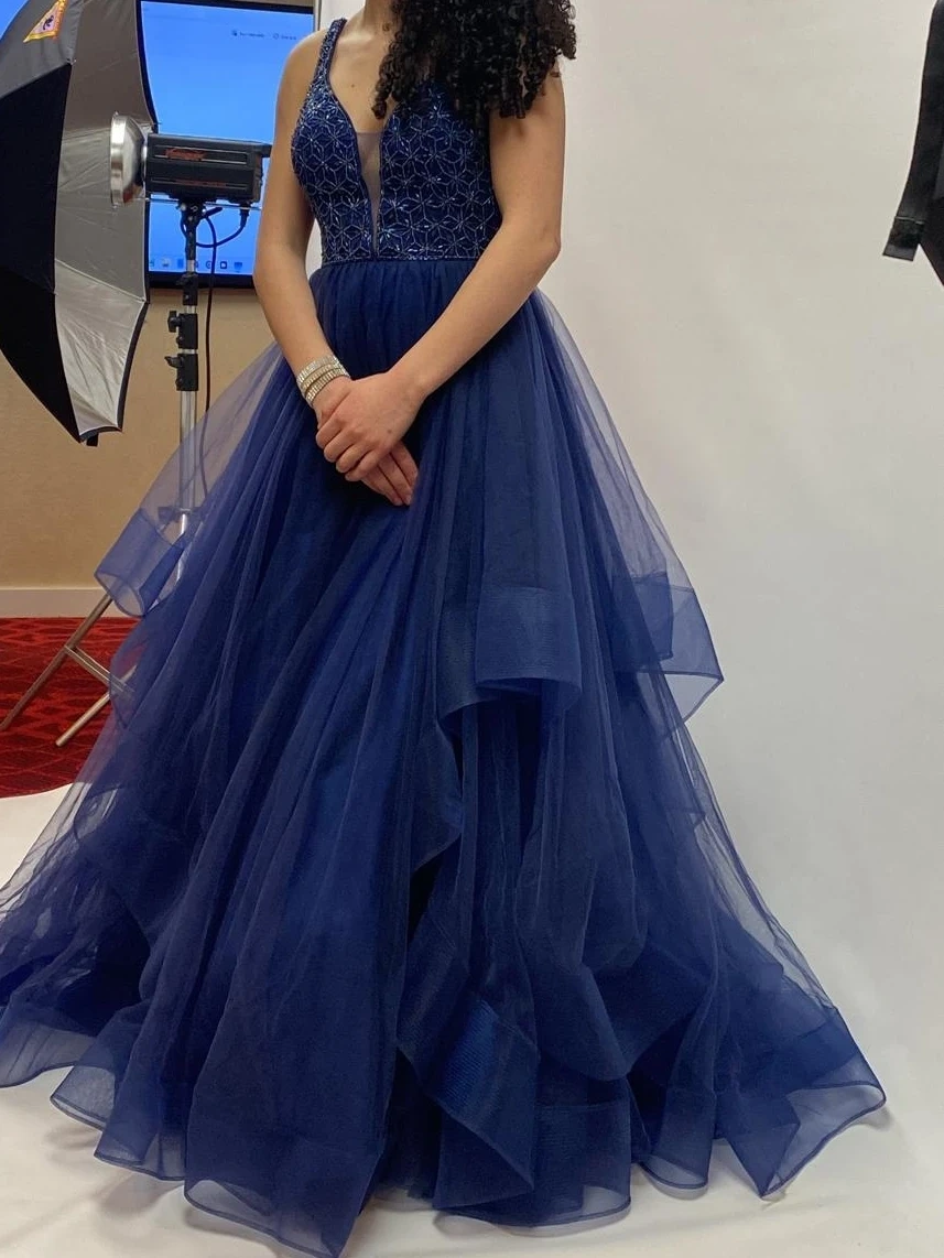 Beautiful navy blue ball gown with a beaded bodice and layered tulle skirt. It features a V-neckline and criss-cross straps in the back. This dress is perfect for special occasions like proms or formal events!
