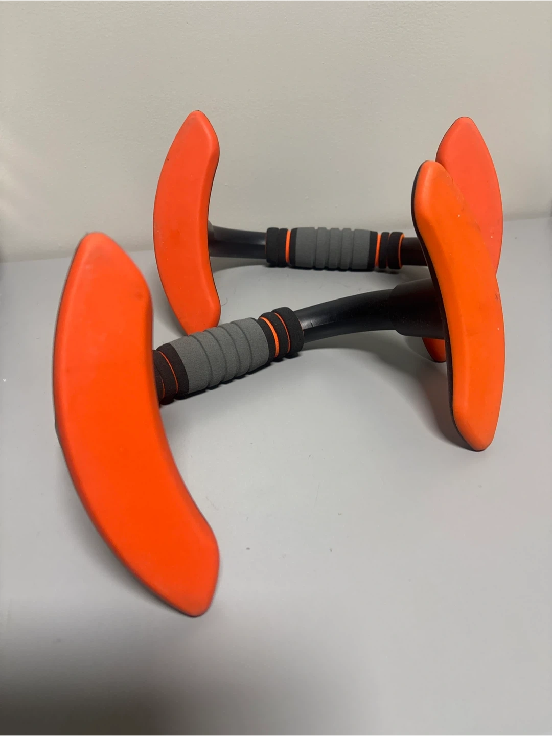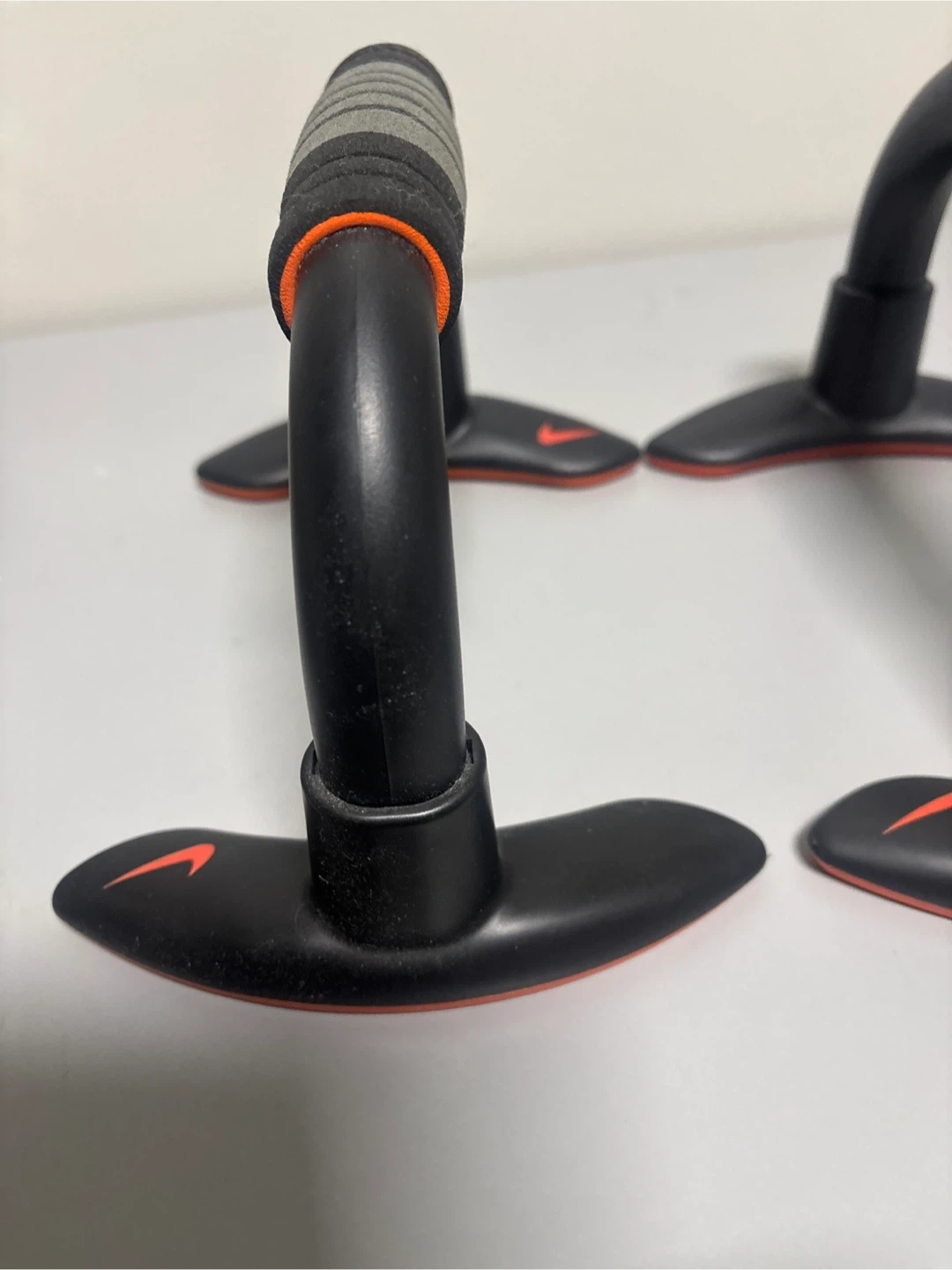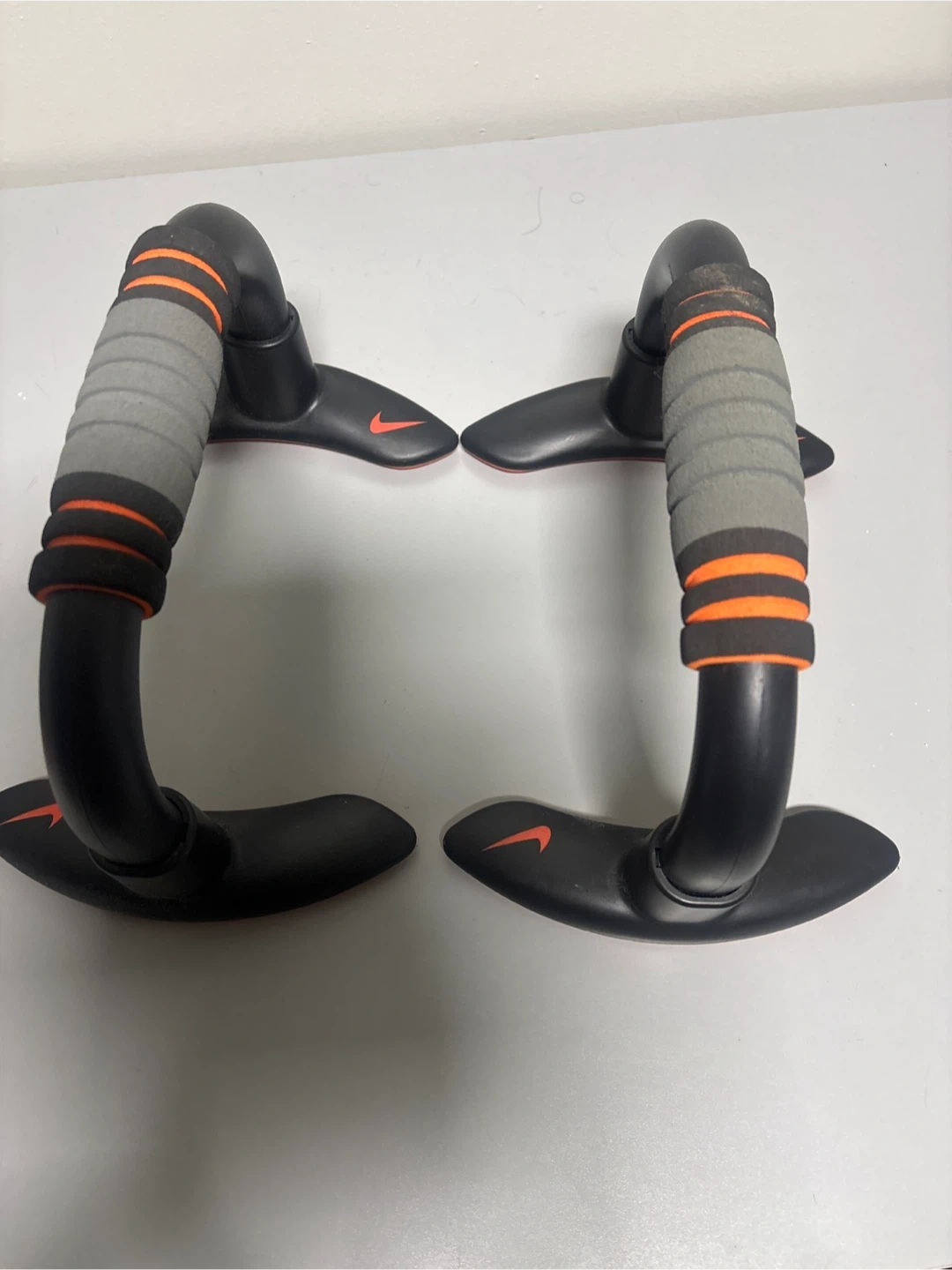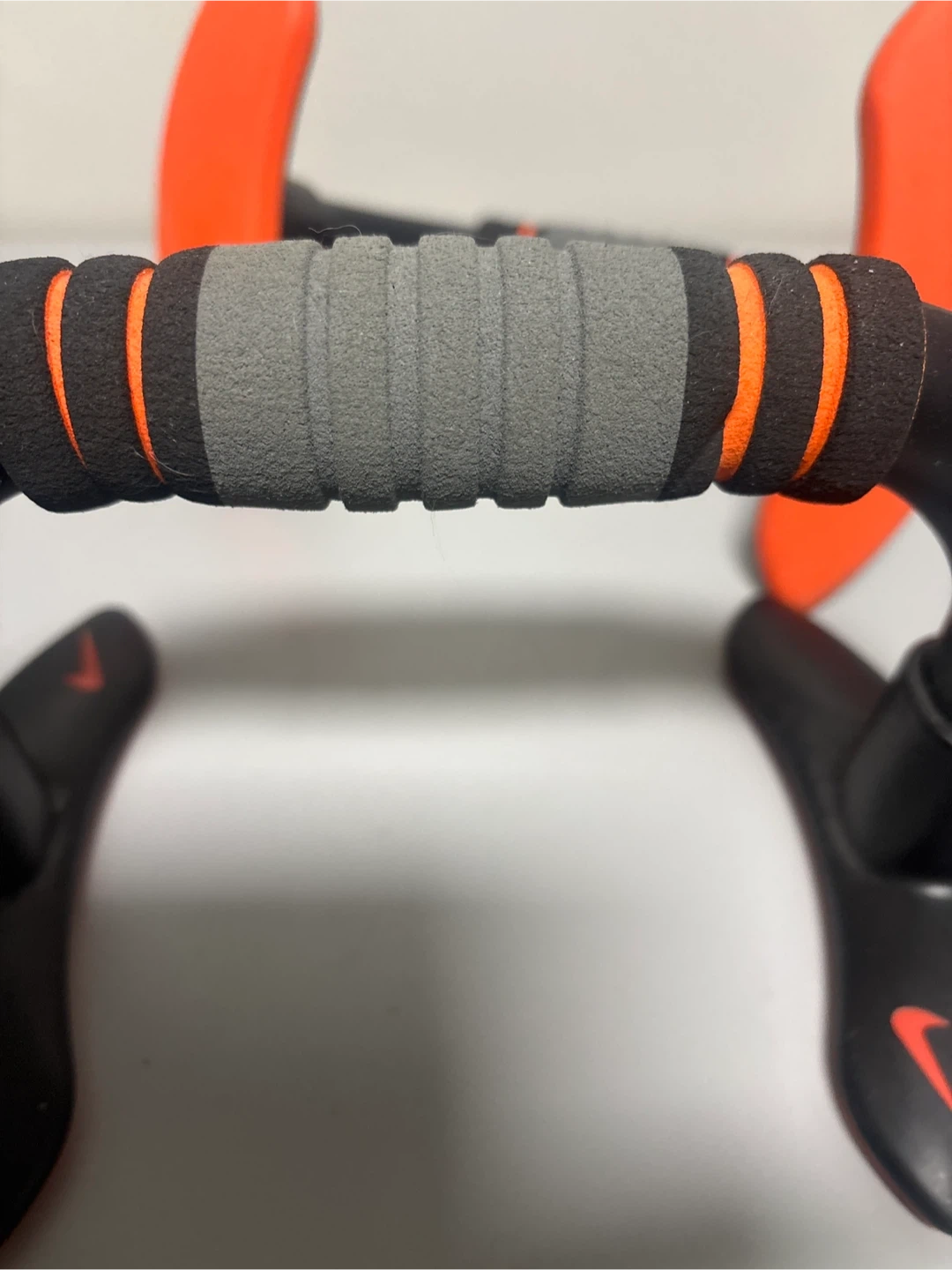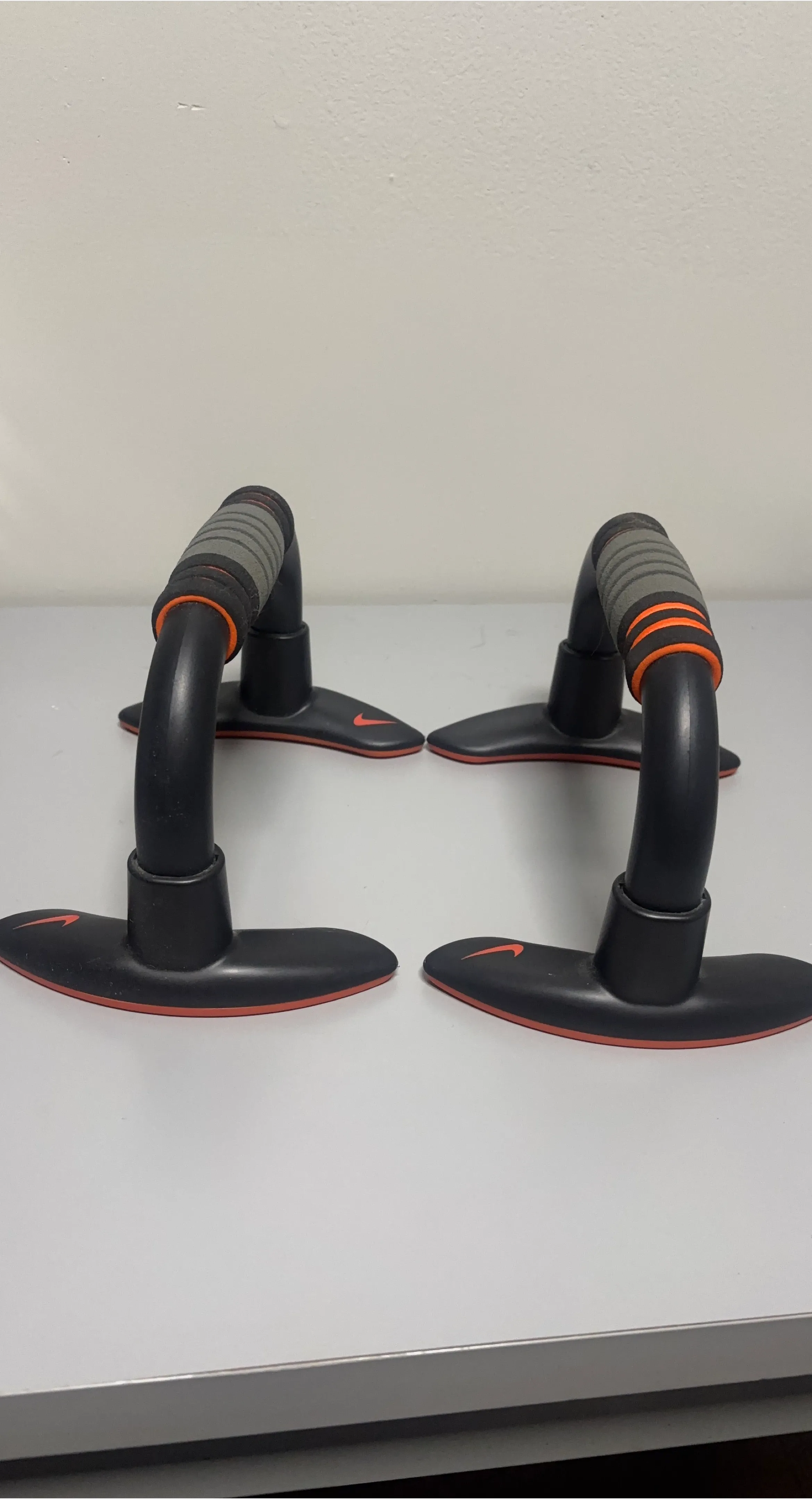 These Nike push up bars feature comfortable padded grips and a stable base. They're black with orange accents and the iconic Nike swoosh logo. Perfect for enhancing your workout routine!