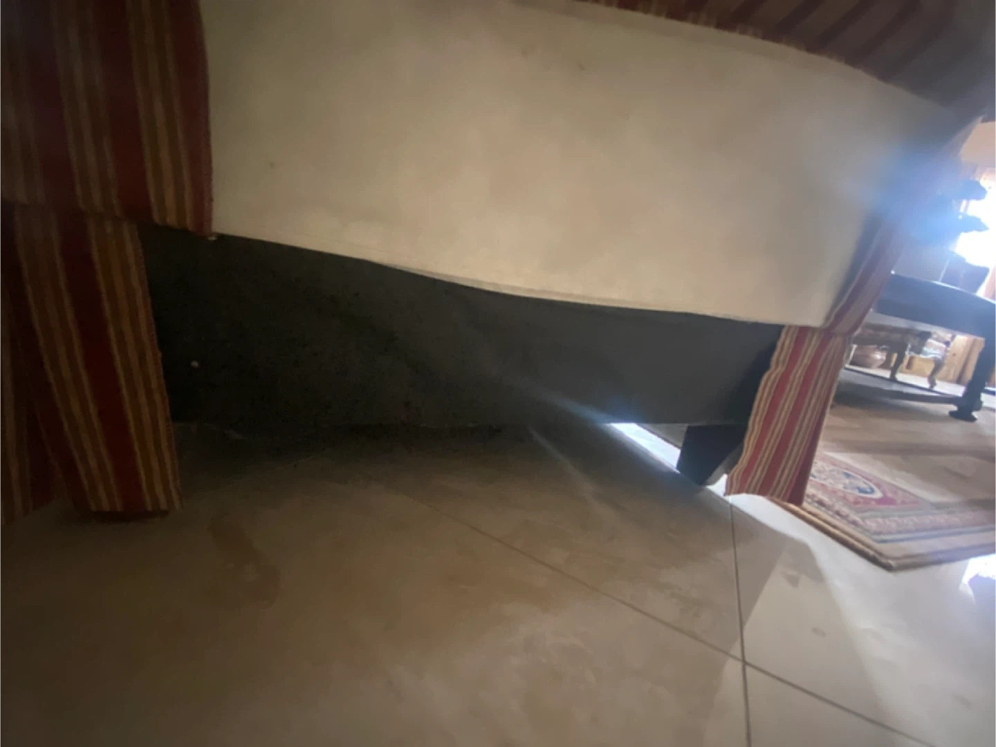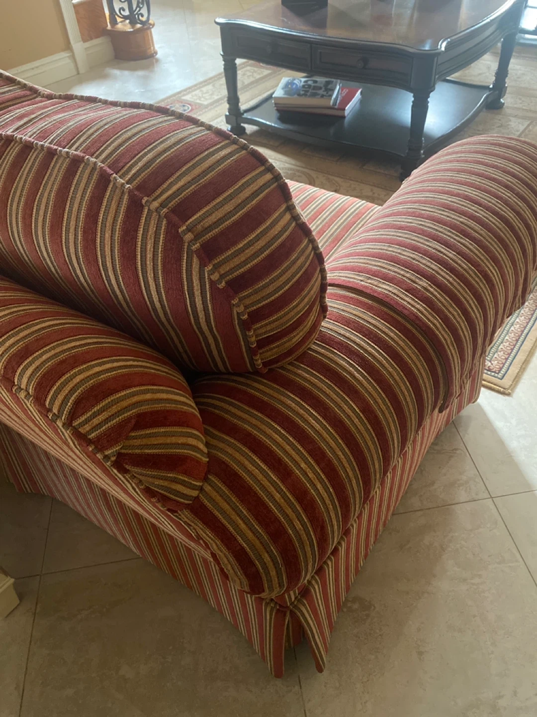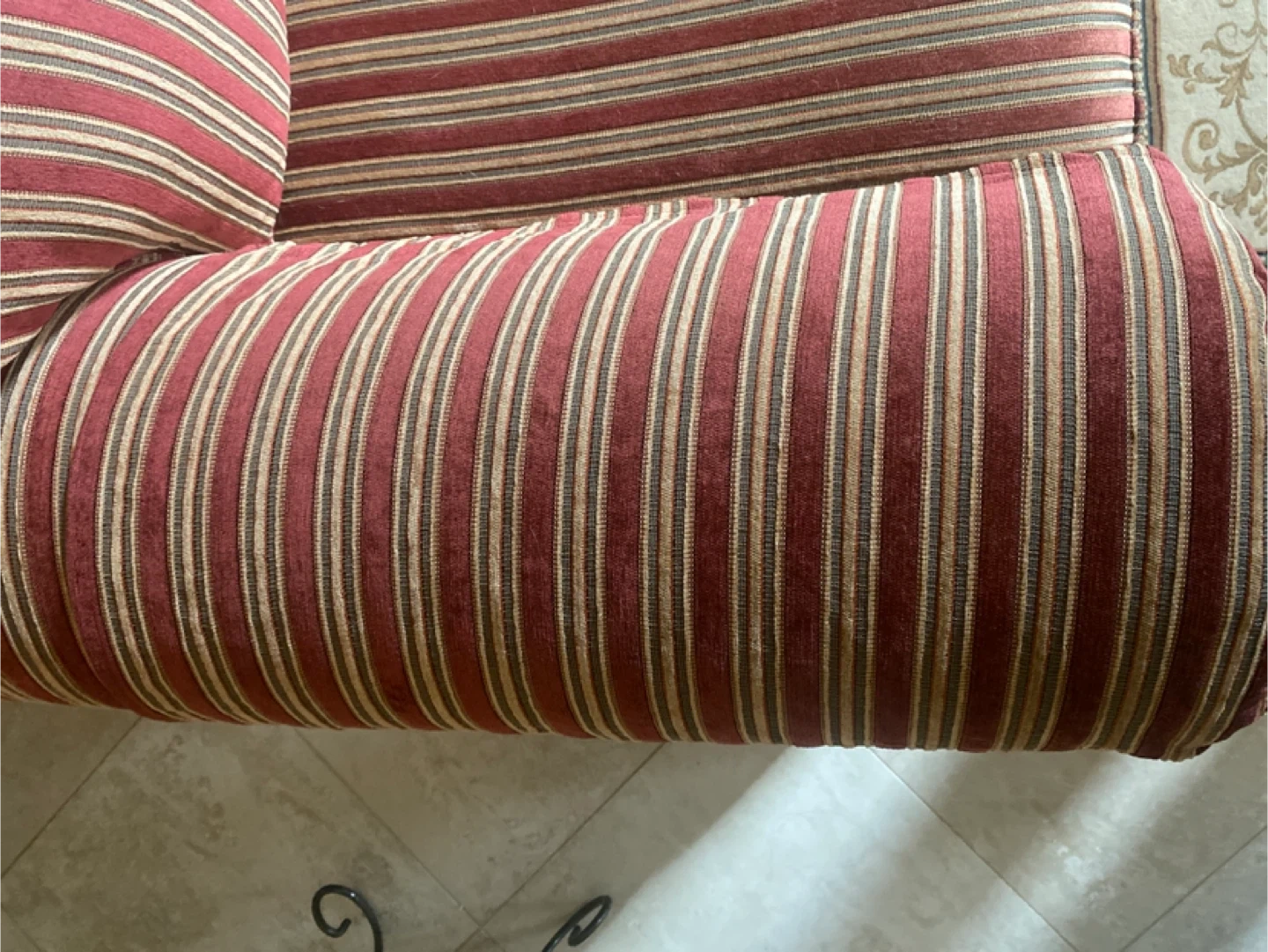 This is a comfortable three-seater sofa with a red, beige, and brown striped fabric. It has plush cushions and a skirted base. This sofa is great for a living room or family room.