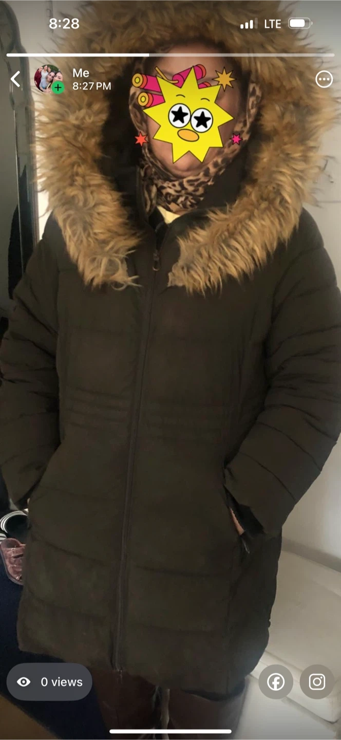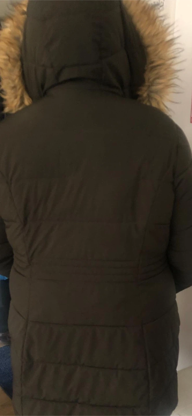 Warm and cozy puffer parka for women, featuring a detached faux fur hood trim. It's a great option for colder weather. The jacket has a full zipper closure and is a dark olive green colour.