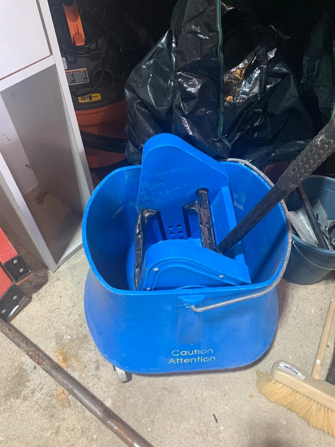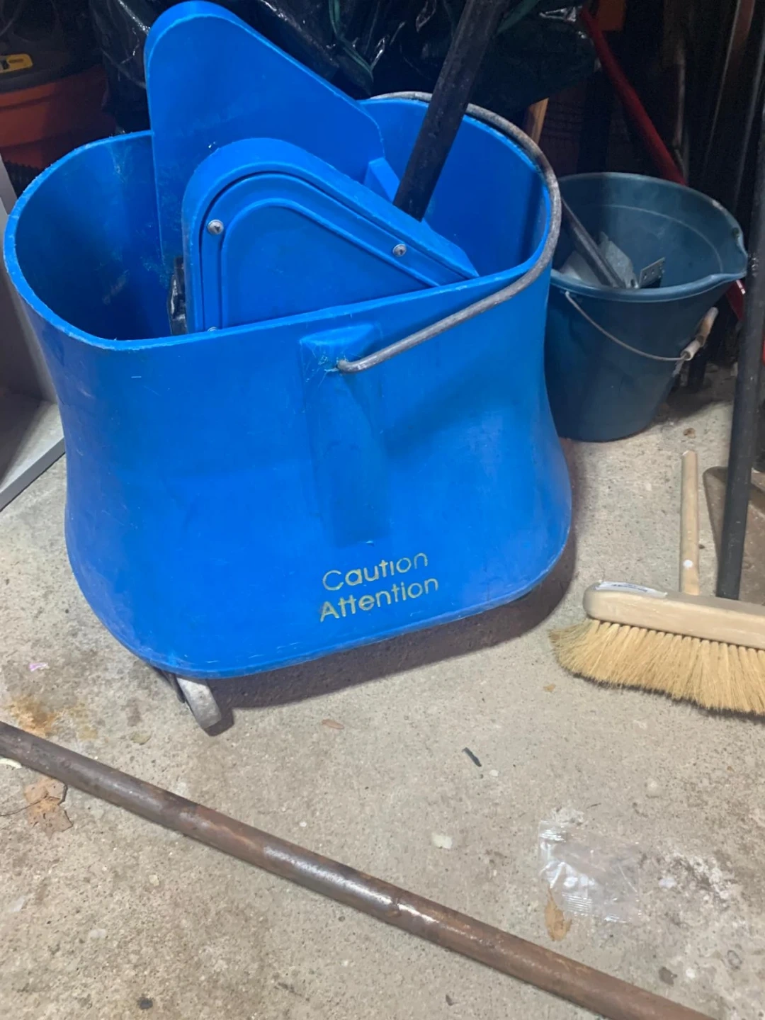 This is a blue mop bucket that includes a wringer attachment. It's made of durable plastic and has wheels for easy transport. Ideal for cleaning larger floor areas efficiently. The wringer helps to remove excess water from the mop.
