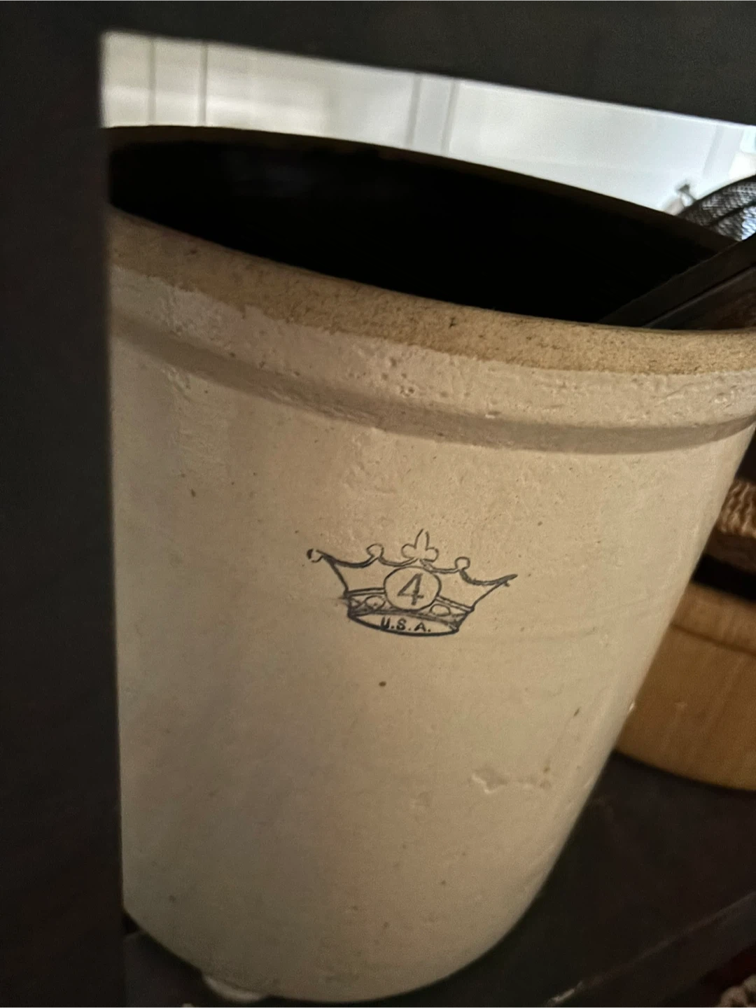 Classic stoneware crock with a crown and "4 U.S.A." marking. This large jug is perfect for storage or decor. It's made of sturdy ceramic material.