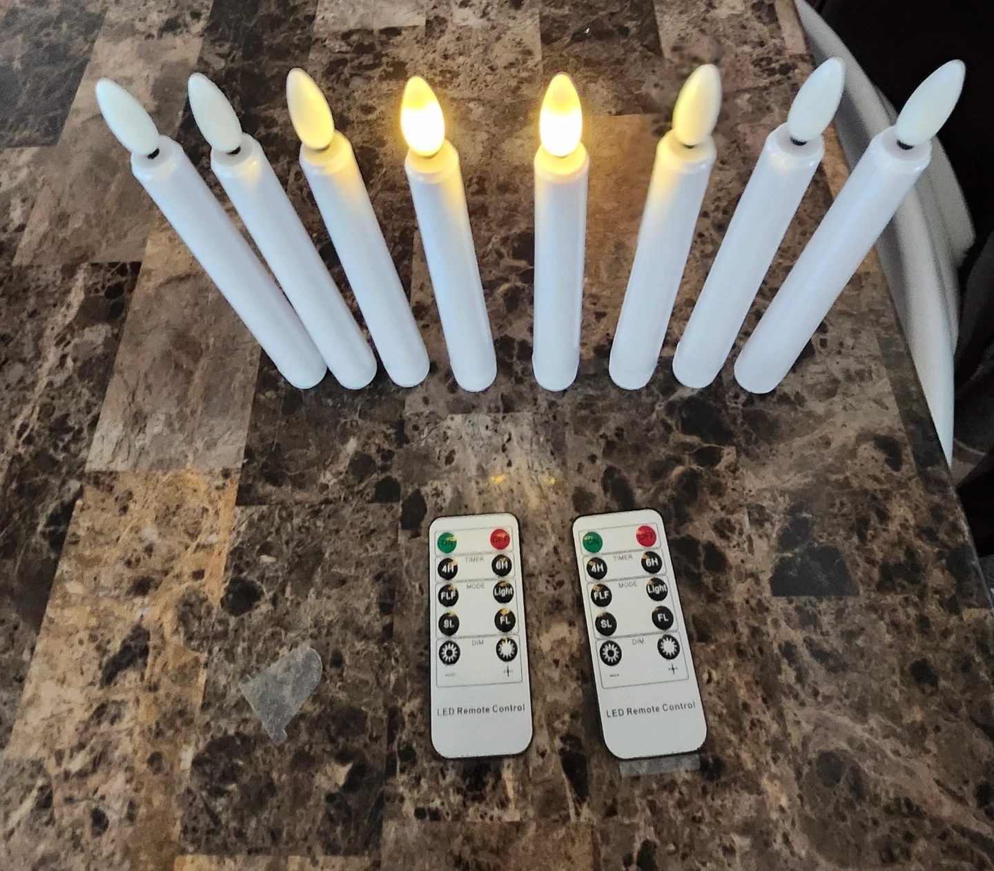 This set includes eight white LED flameless taper candles. Two remote controls are provided for operation. They offer adjustable brightness and timer functions for convenience.