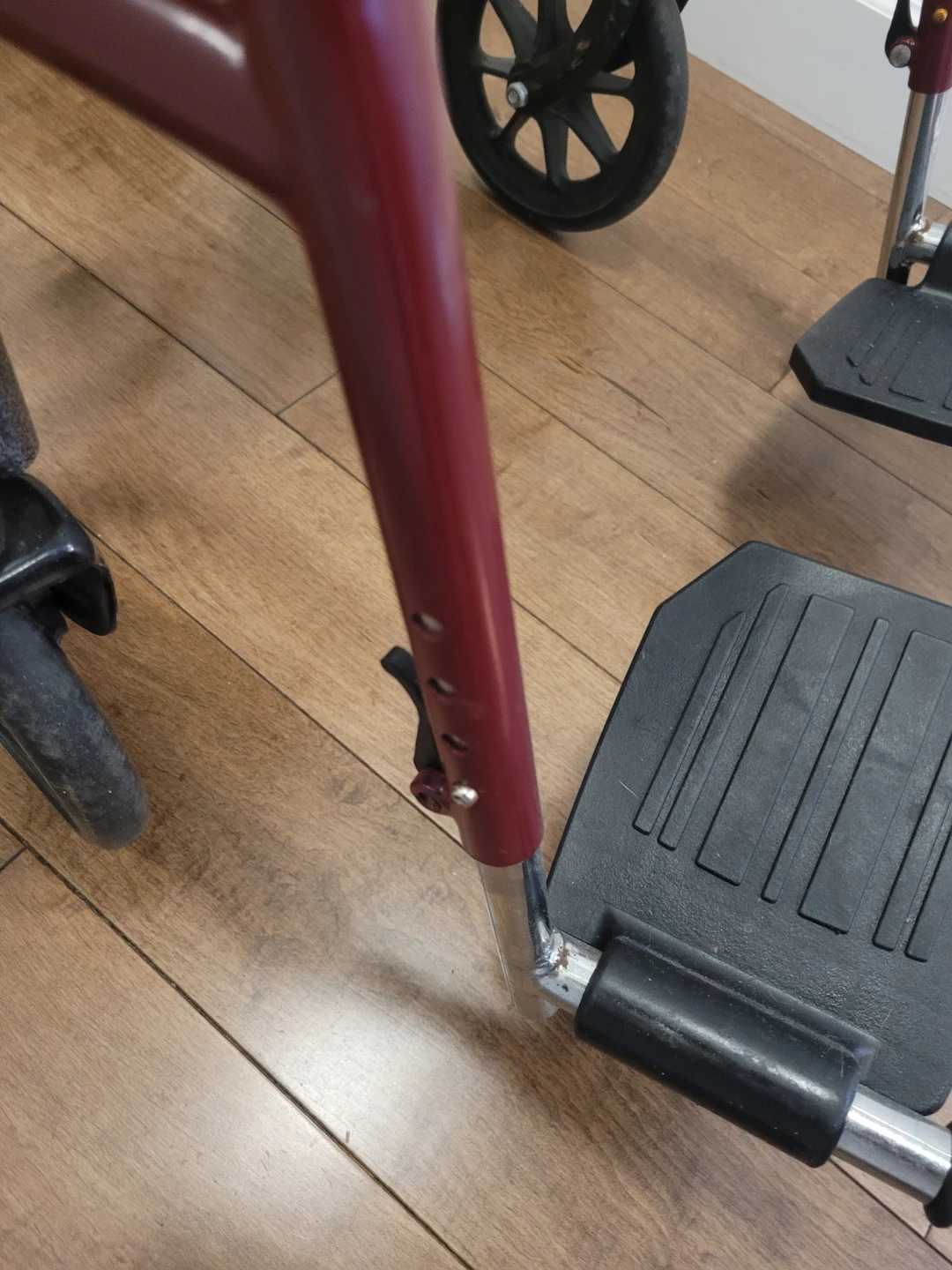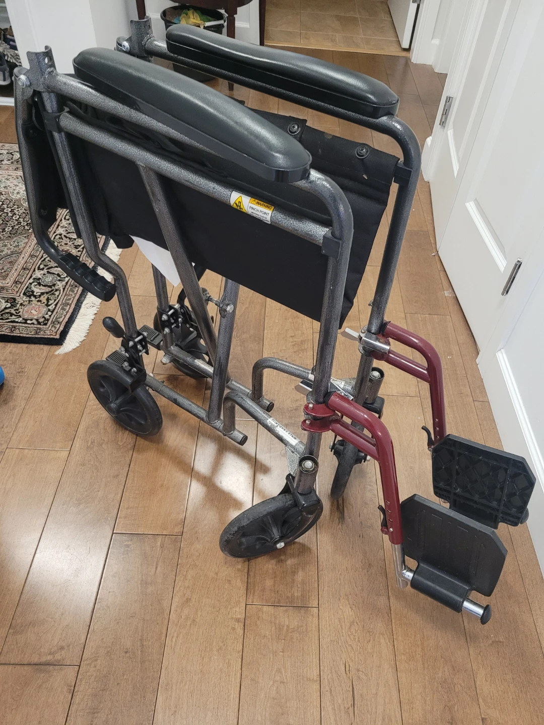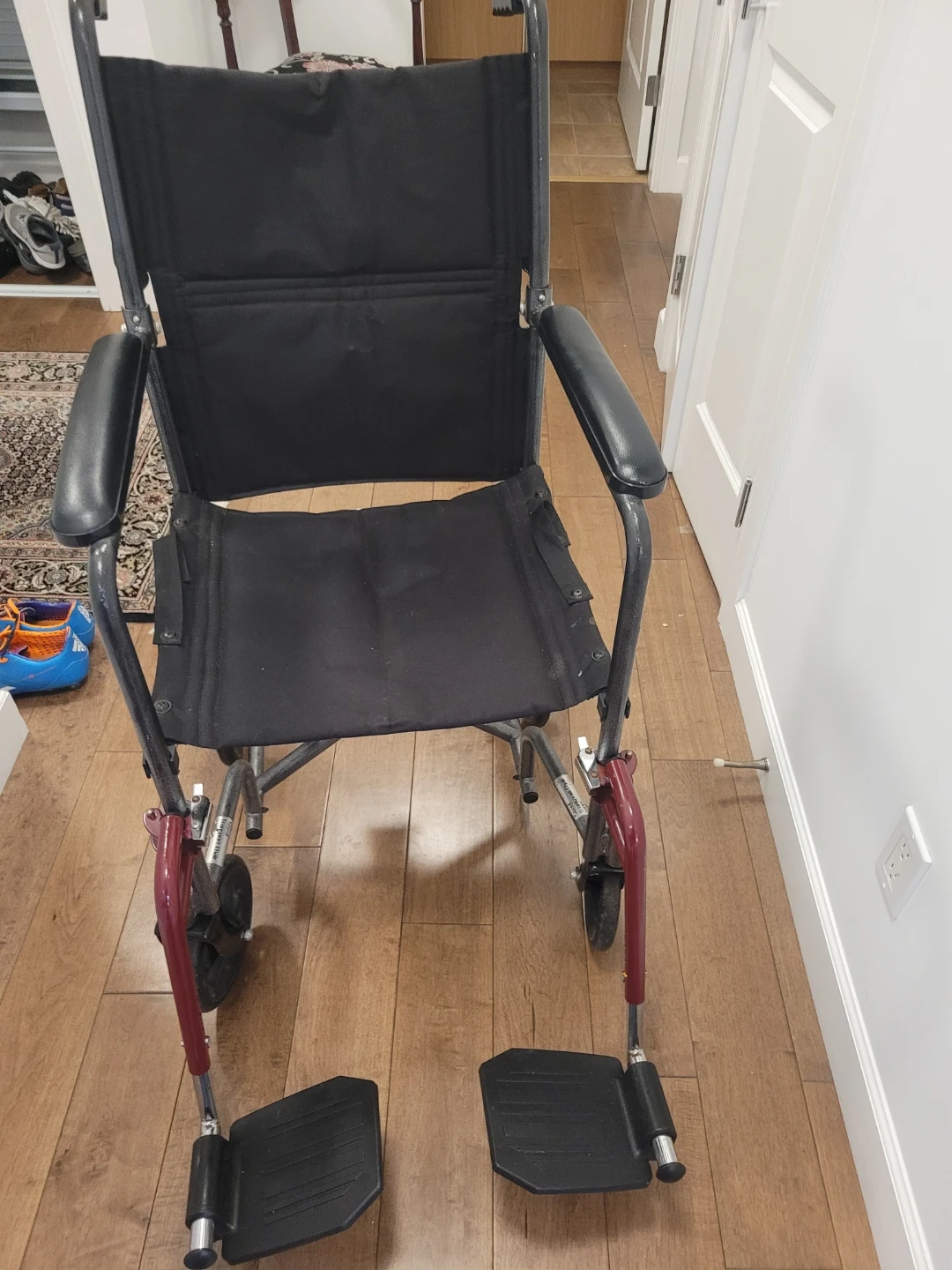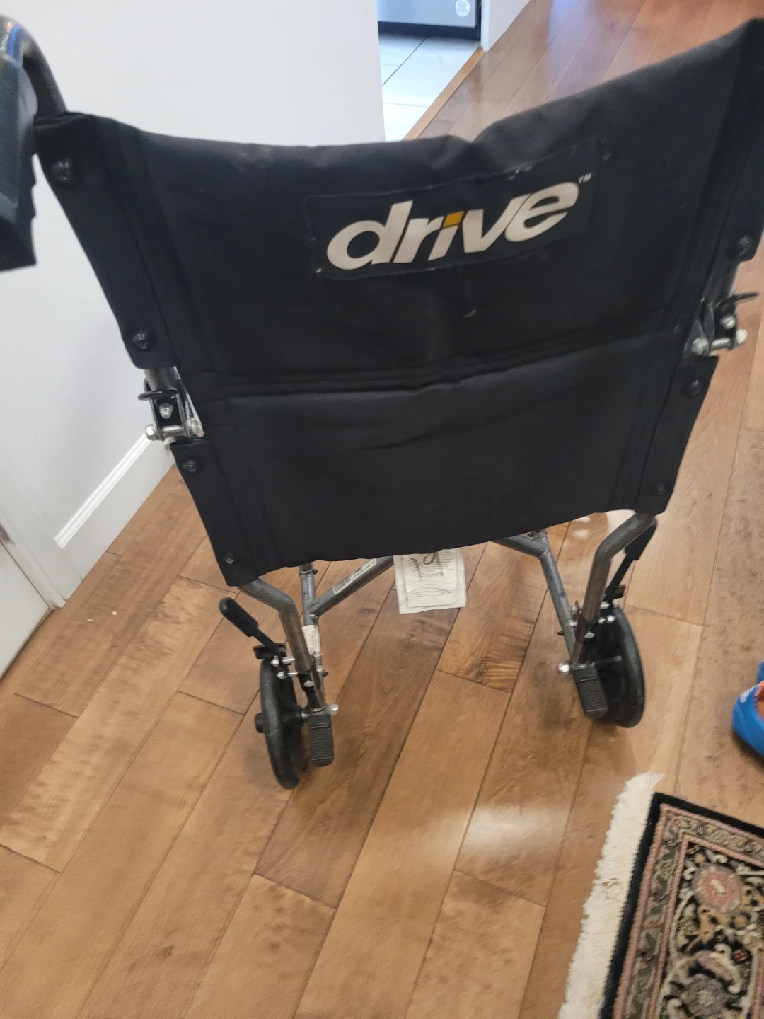 Drive Transport Series wheelchair. It's black with a steel frame. Includes adjustable footrests and padded armrests.The seat is 16"x16"