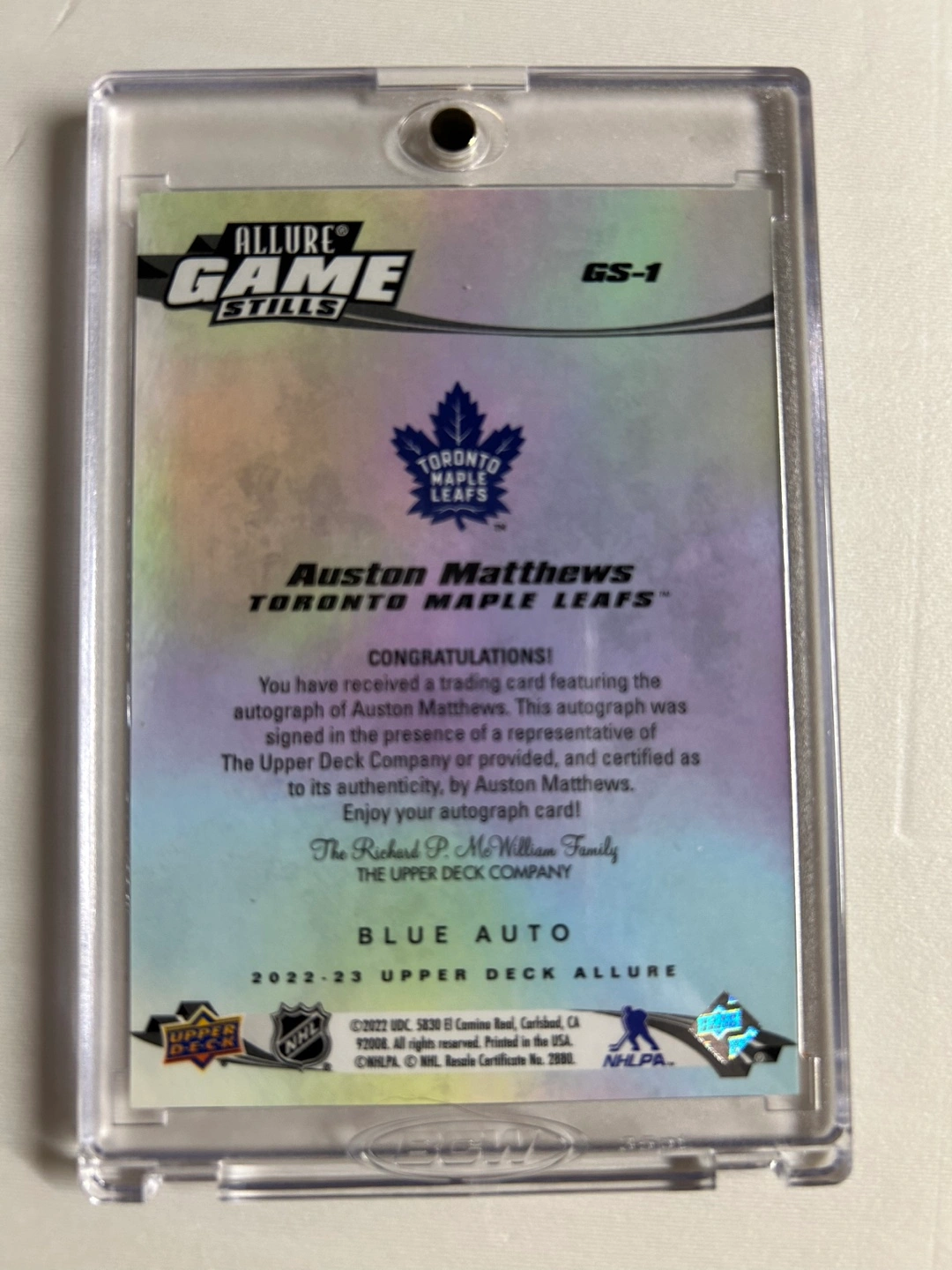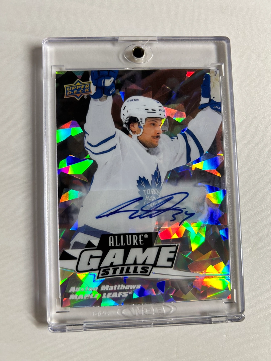 Autographed hockey card featuring Auston Matthews of the Toronto Maple Leafs. 2022-23 Upper Deck Allure Game Stills series. Blue auto. In a protective case.