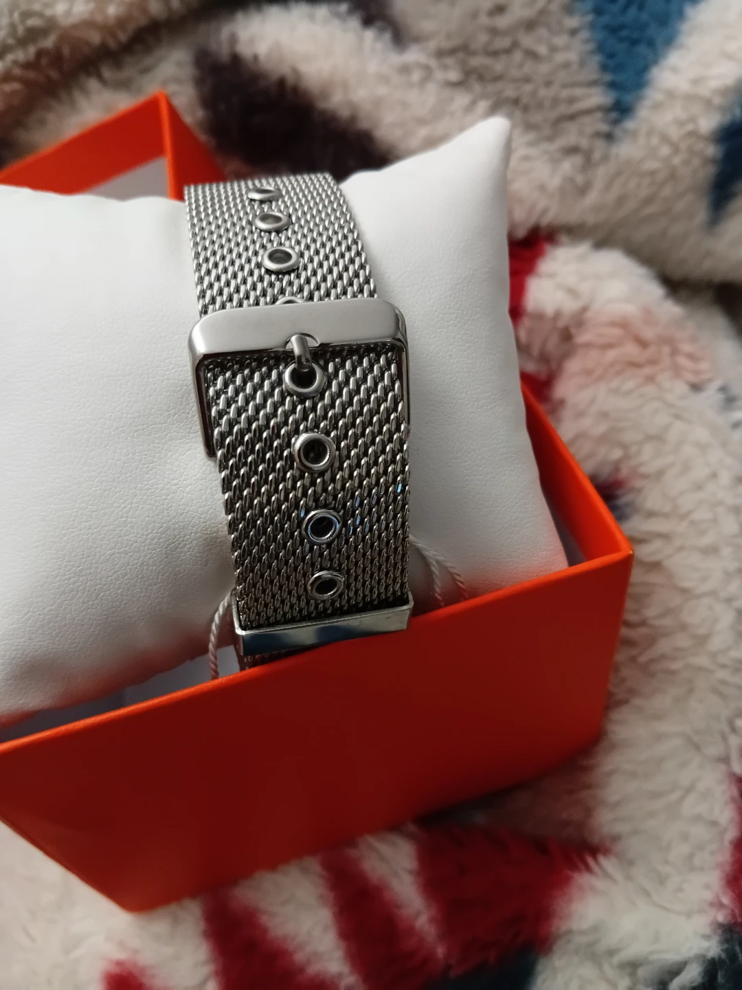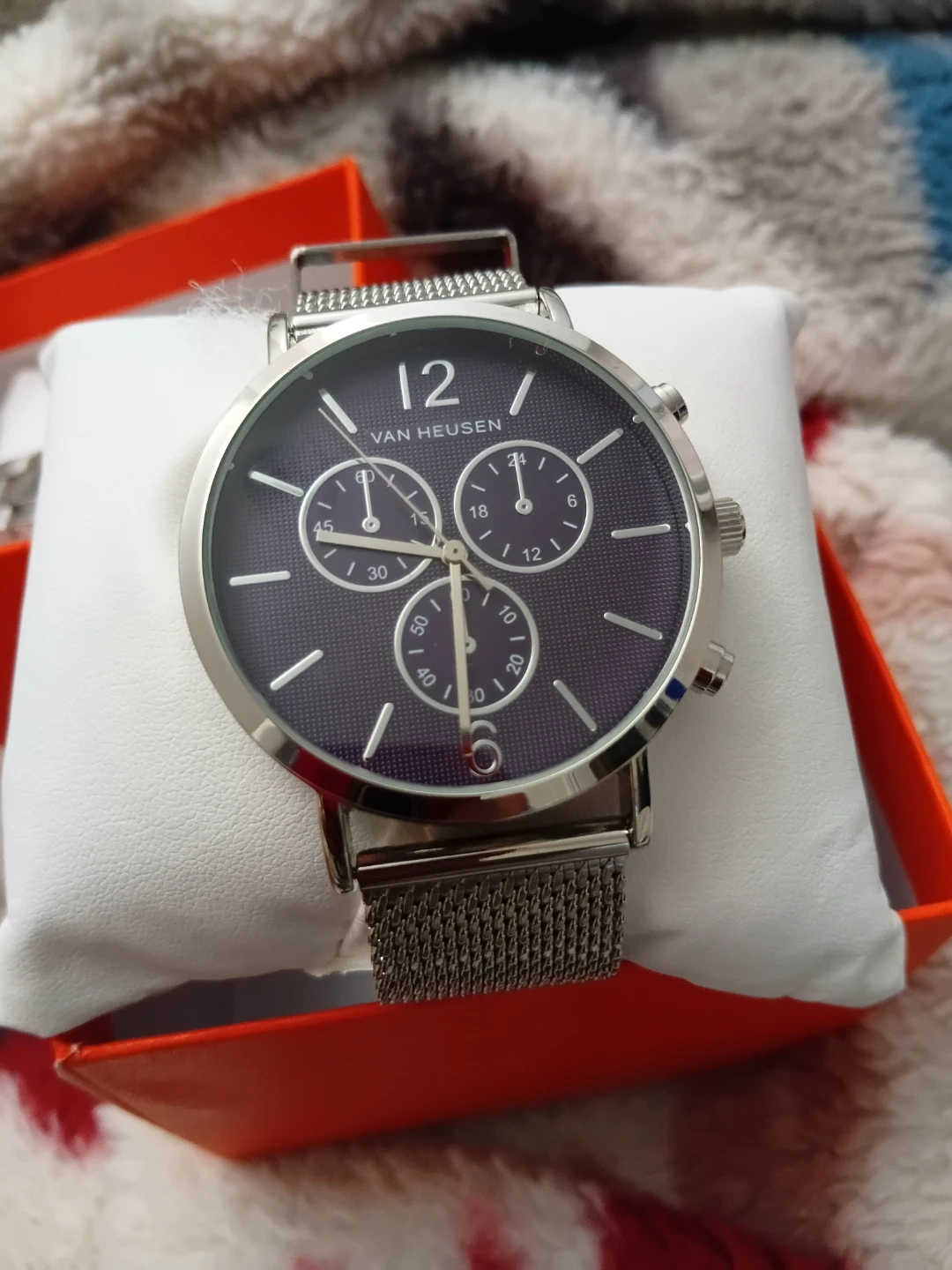 A stylish Van Heusen men's watch with a dark blue face and a silver mesh strap. It comes in its original orange box, perfect for everyday wear or as a thoughtful gift. The watch features a reliable quartz movement.