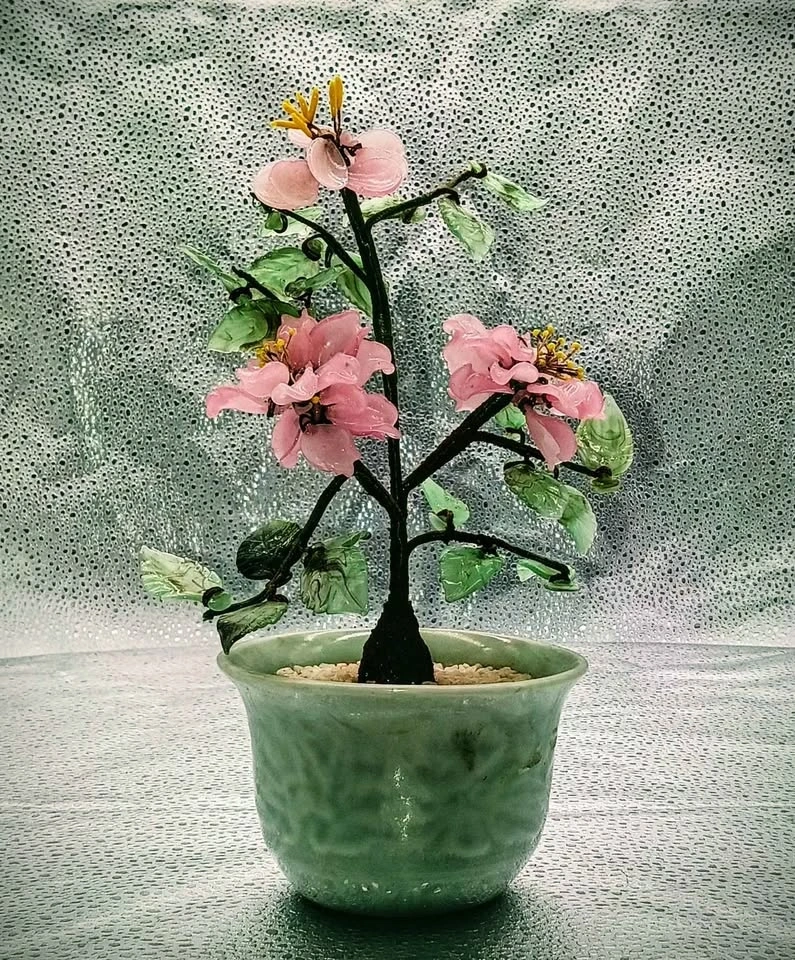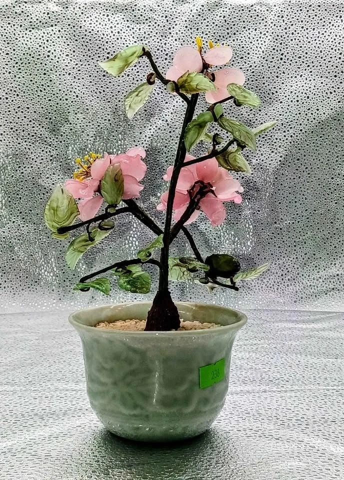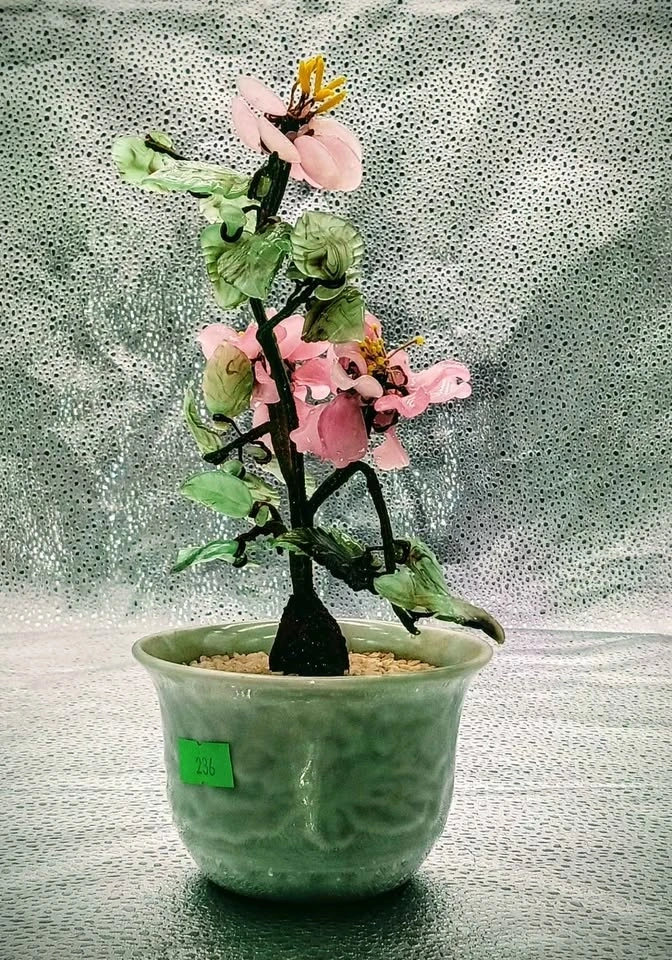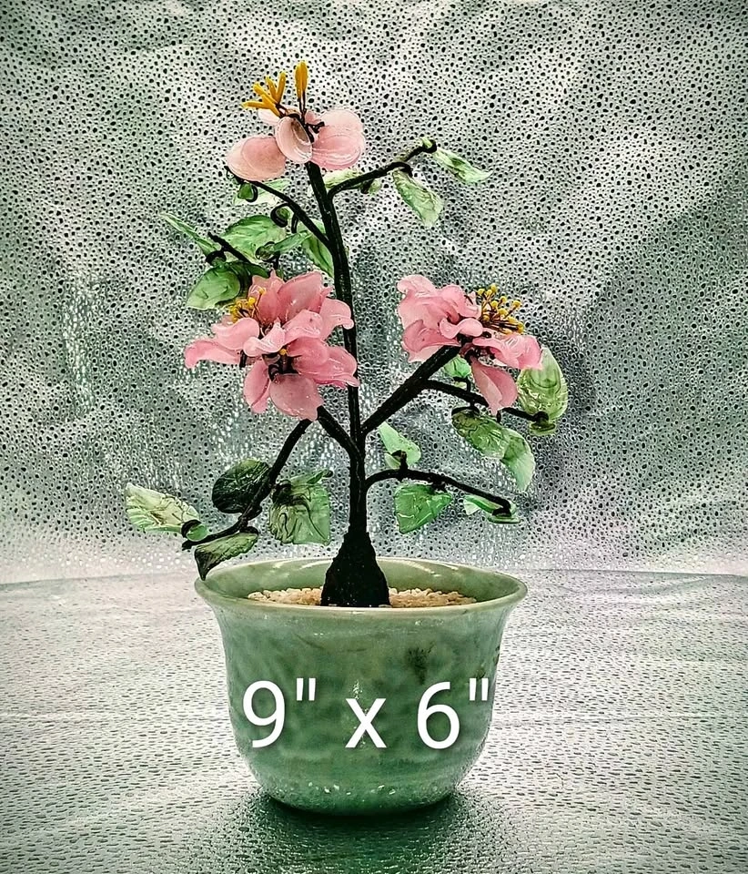 Vintage Green Jade and Rose Glass Bonsai Cherry Tree