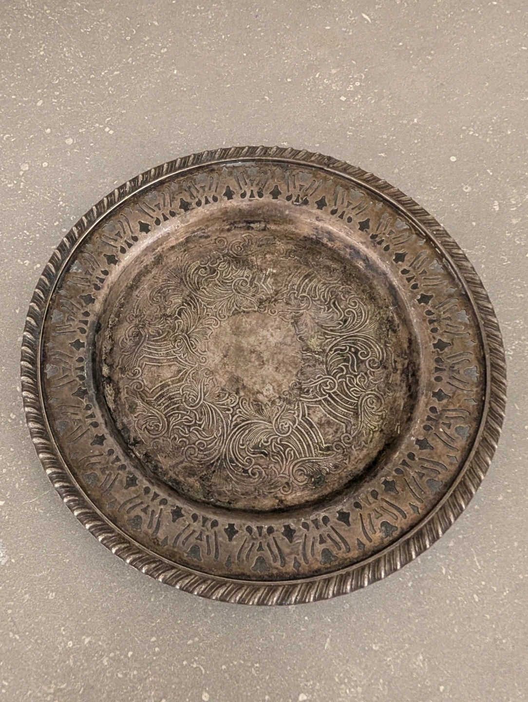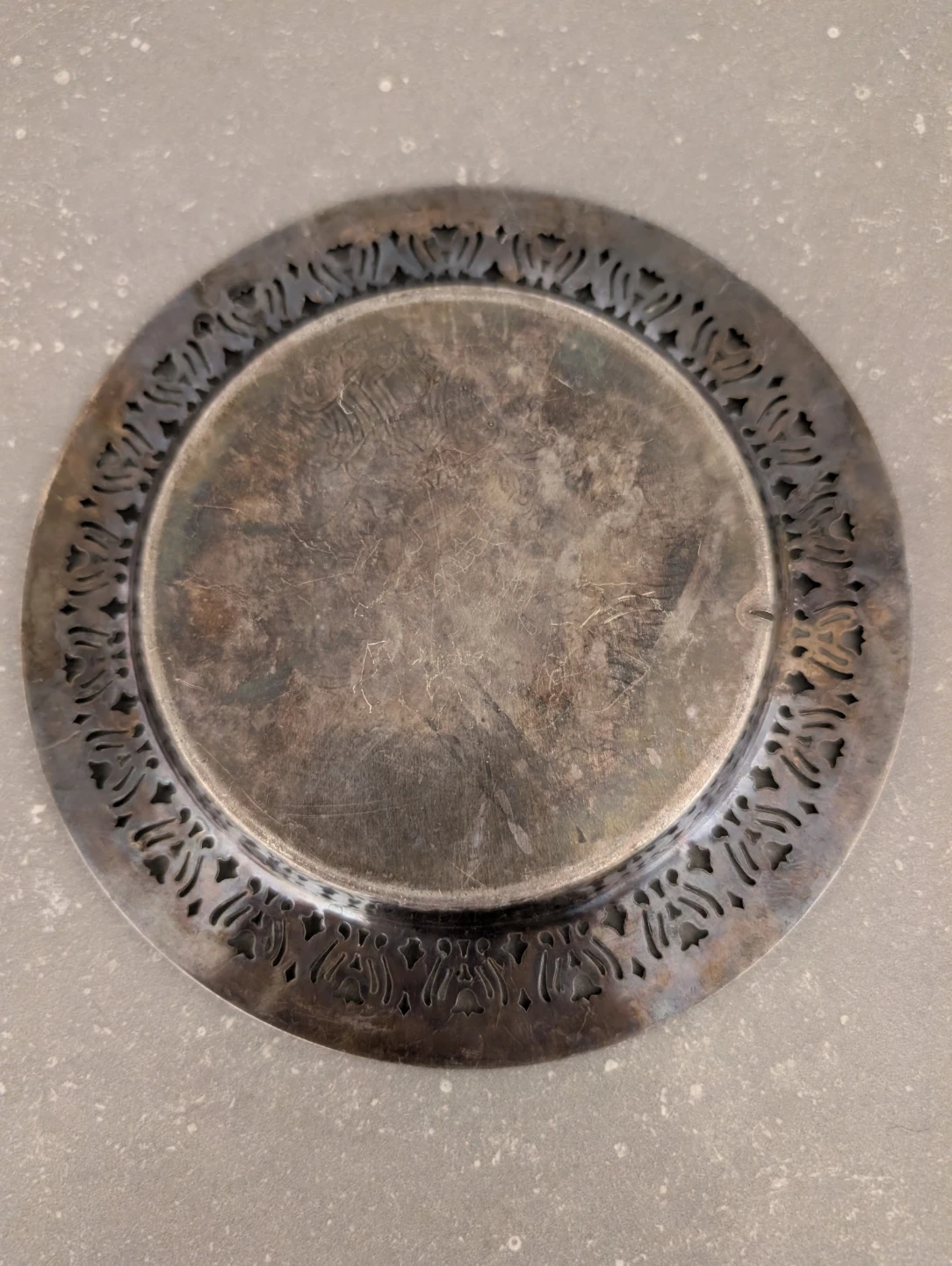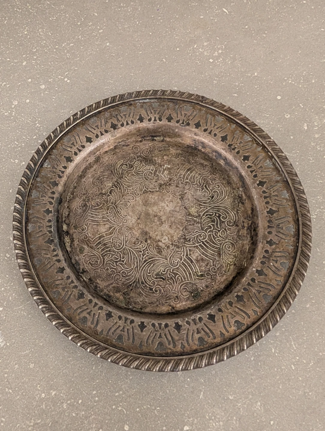 This is a decorative silver-plated serving tray with an ornate, filigree edge. The detailed engravings on the centre would make it a lovely decorative piece for a tabletop.