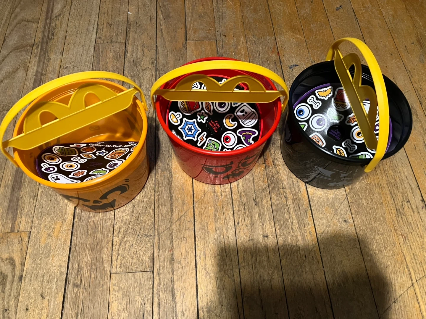 Selling a set of three McDonald's Halloween pails! These are the classic buckets with the iconic McDonald's handle. Great for collectors or for some Halloween fun. Each pail features a different spooky design in orange, red, and black.