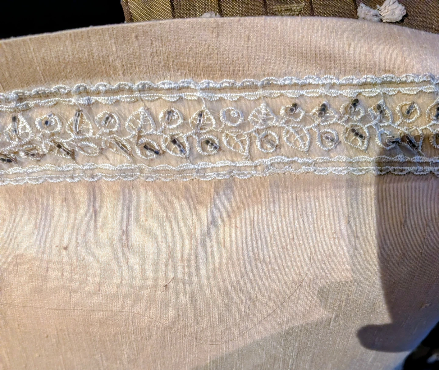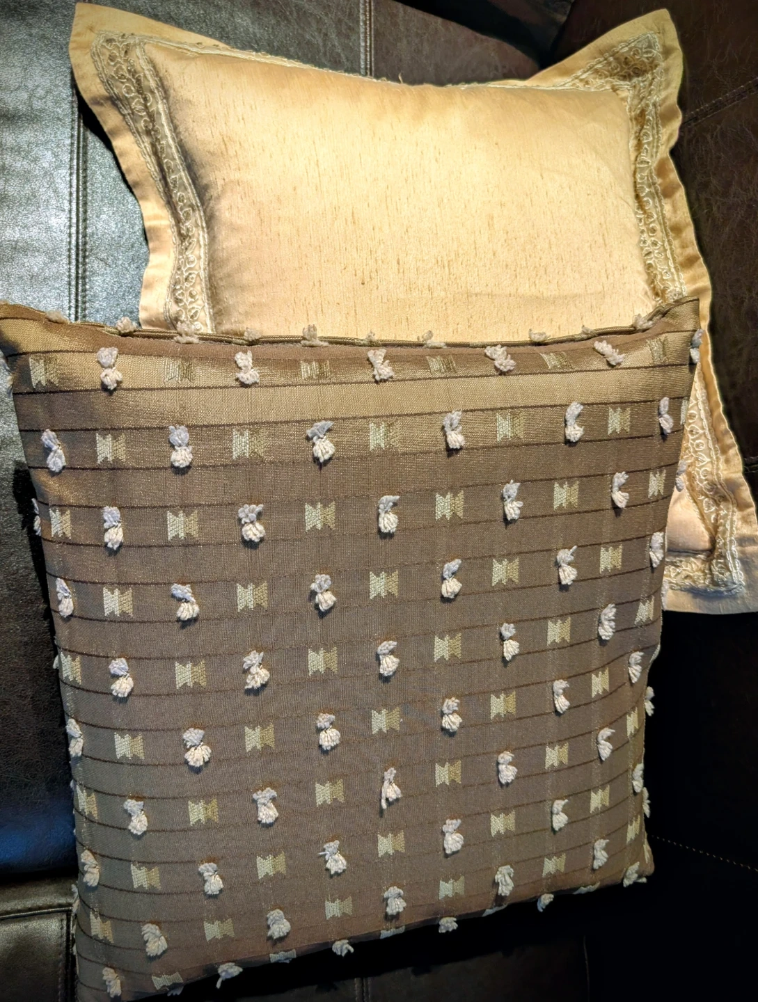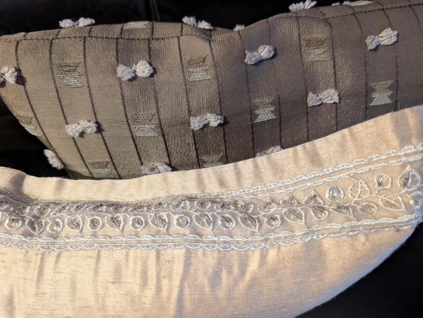 Decorative throw pillow with textured grey fabric and subtle geometric pattern. Cream coloured pillow with embroidered trim also included. They're nice accent pieces!