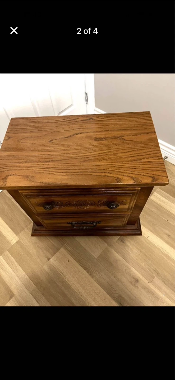 Solid Oak nightstand with two drawers. It features ornate detailing on the top drawer and dark metal hardware.