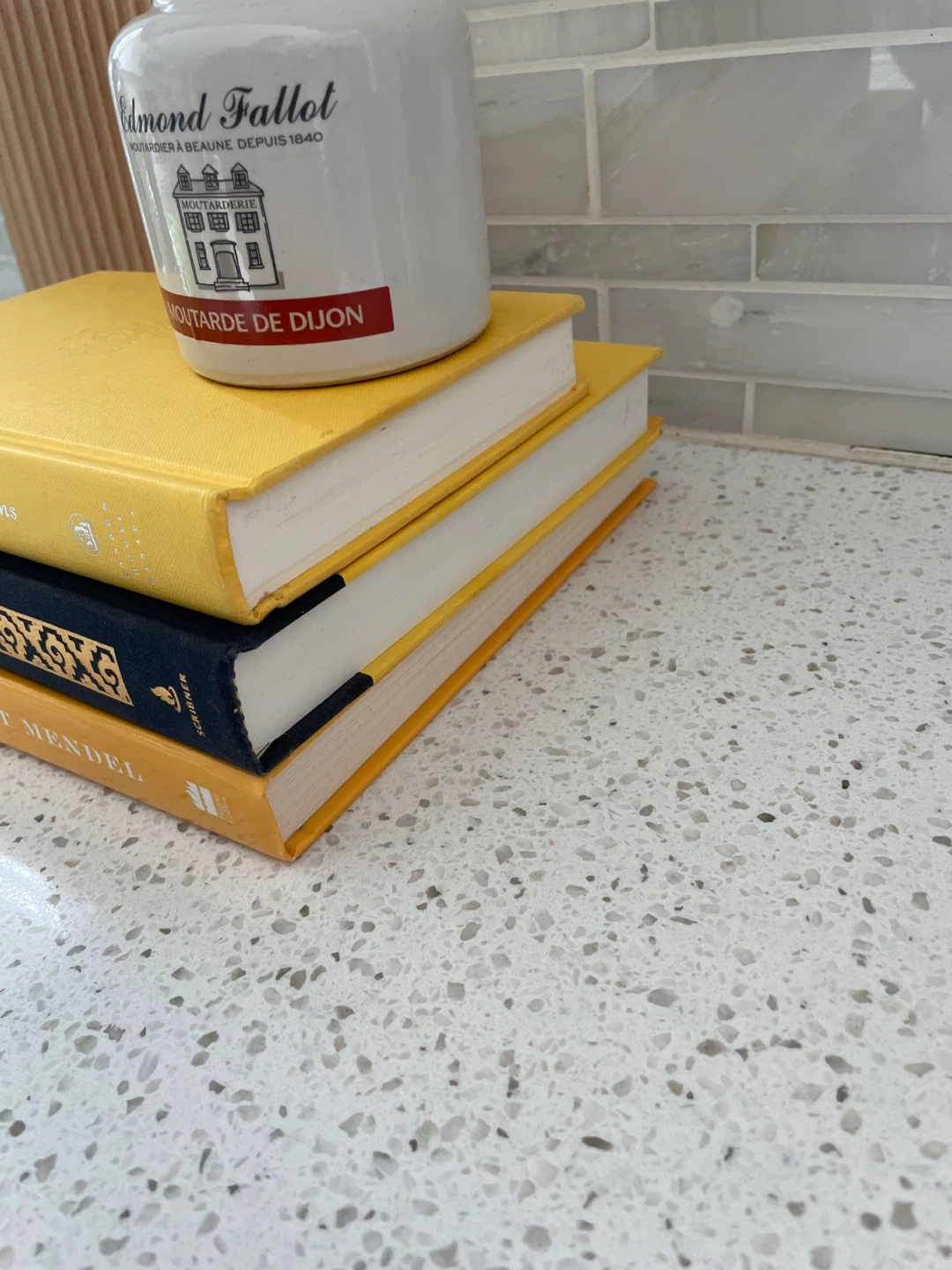Fun bright decor for your kitchen or coffee table! Beautiful yellows and navy blues