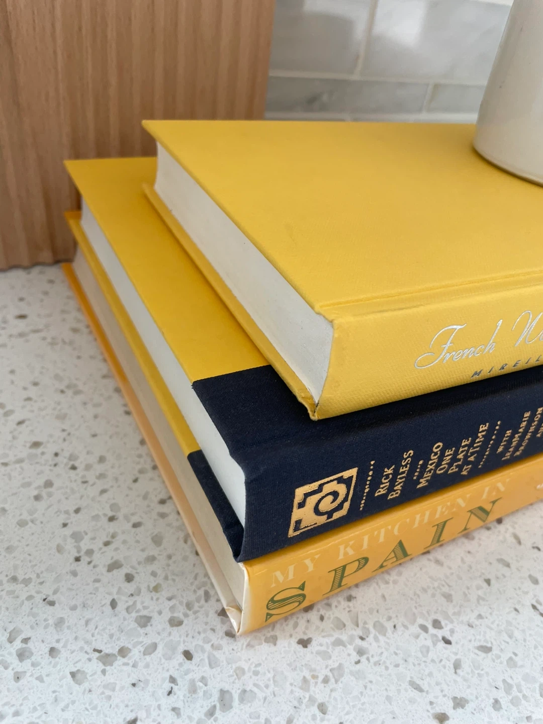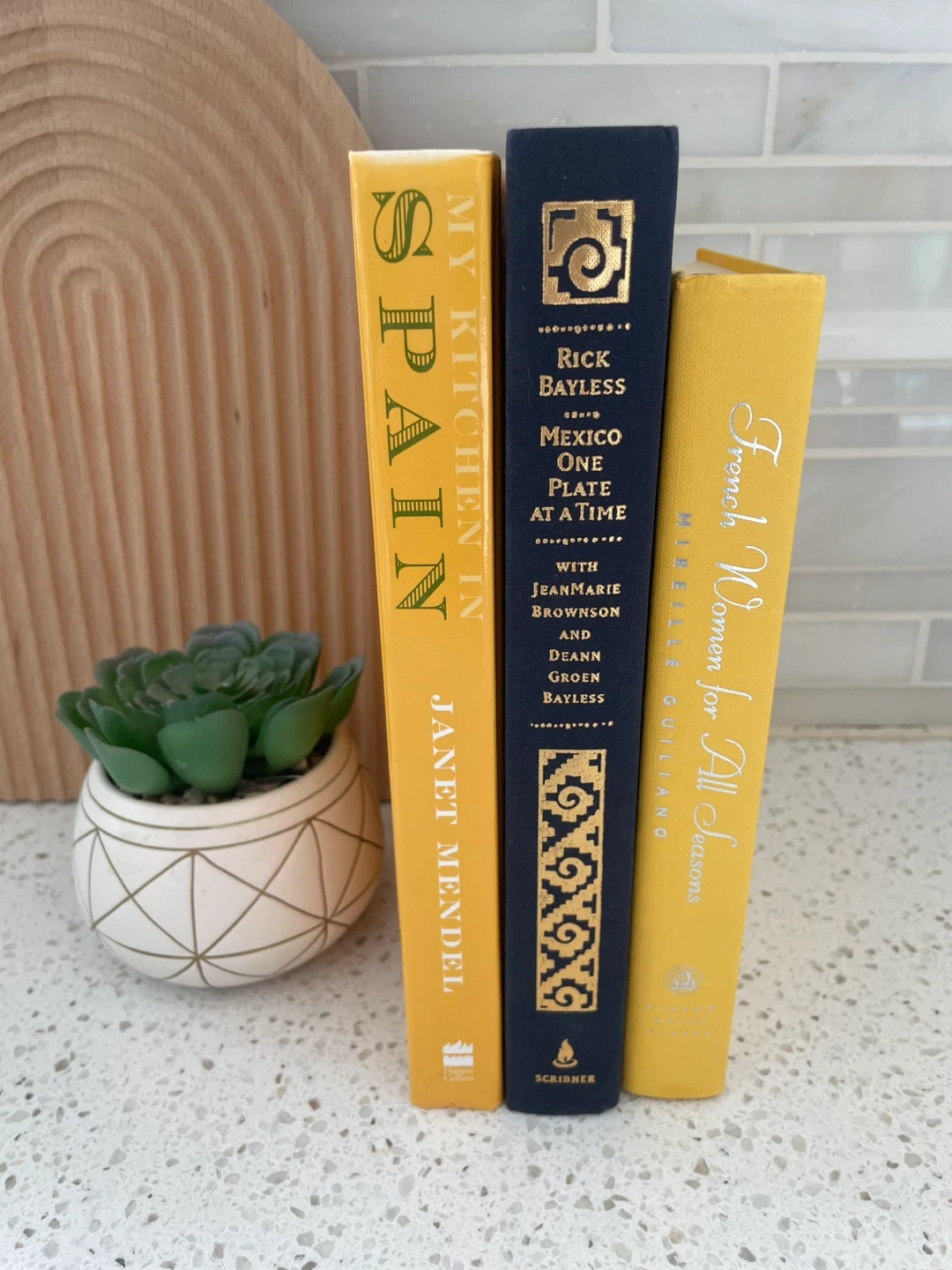 Three hardcover cookbooks included: 'My Kitchen in Spain' by Janet Mendel, 'Mexico One Plate at a Time' by Rick Bayless, and 'French Women for All Seasons' by Mireille Guiliano. These culinary guides cover diverse cuisines and cooking techniques.