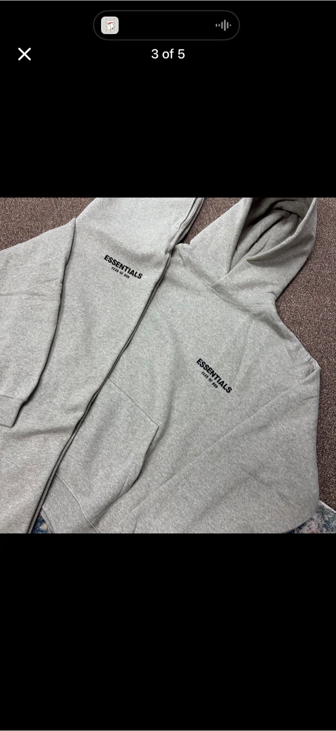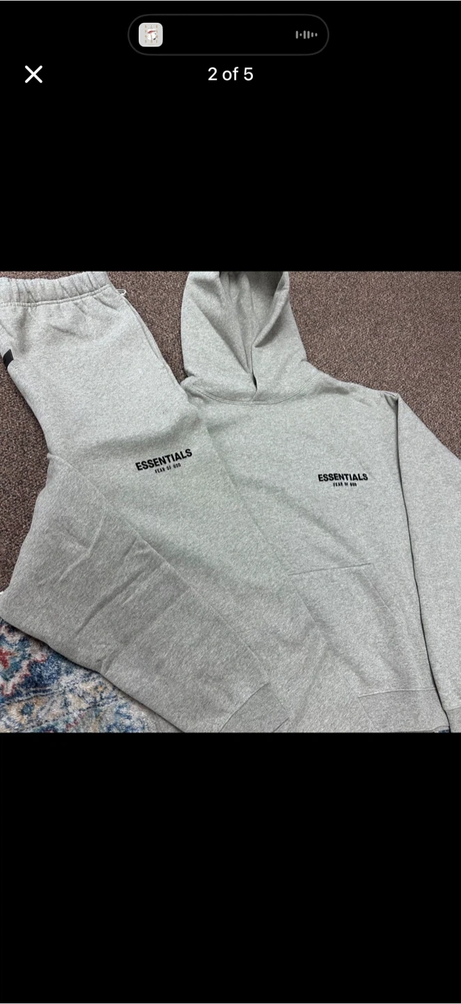 This is a grey hoodie and sweatpants set from Essentials Fear of God. It's made of a soft cotton blend material. The set is great for casual wear.