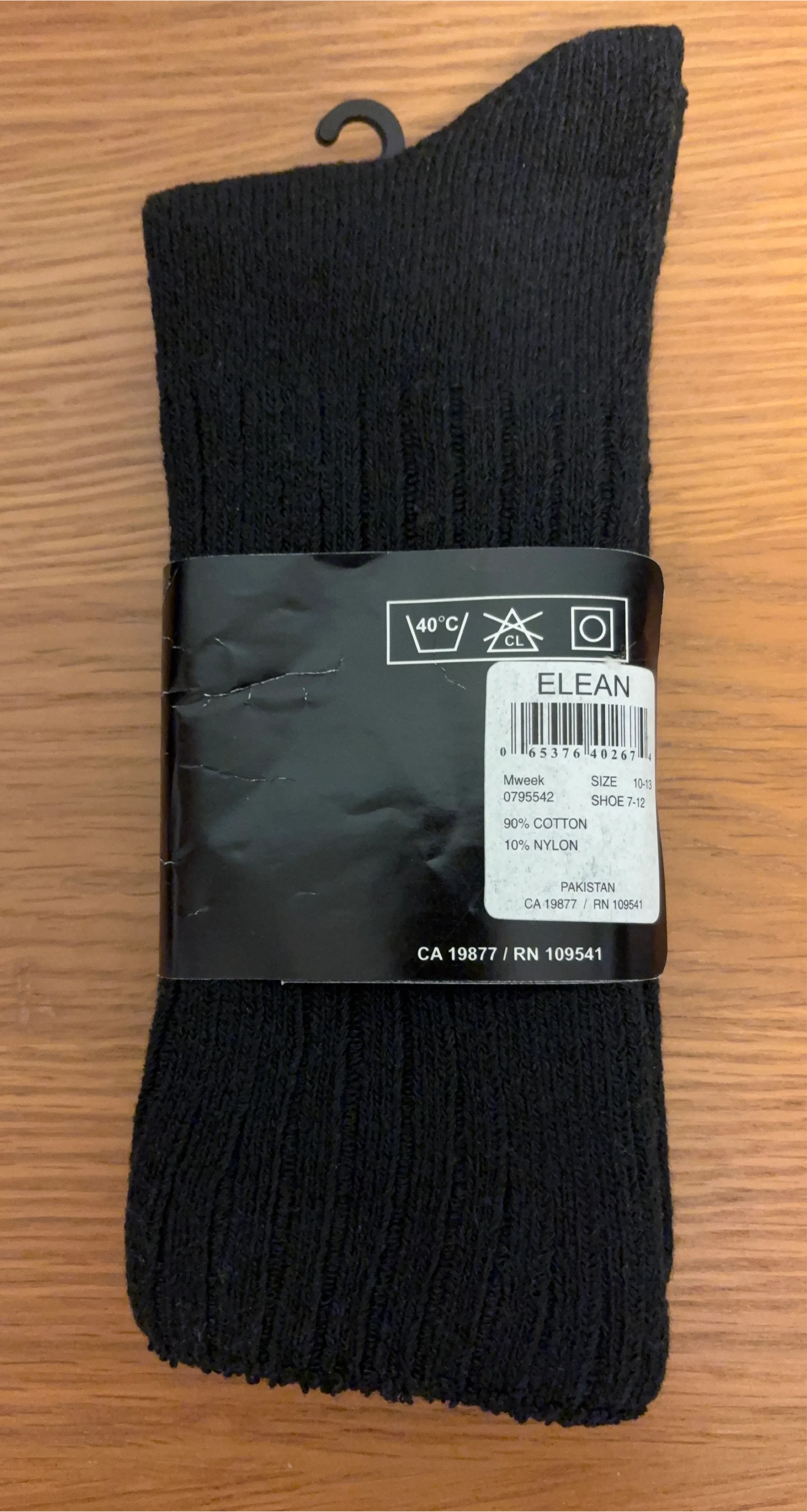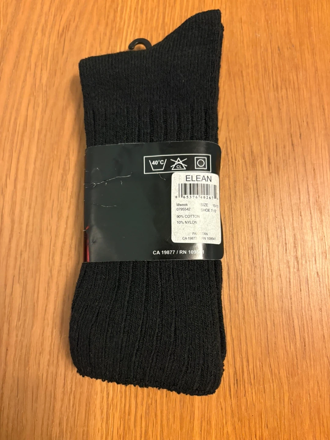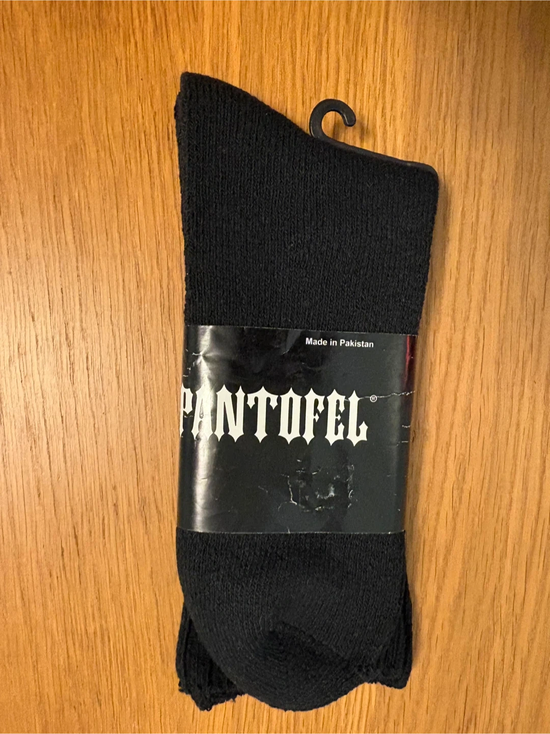 A pair of black thick Pantofel socks, good for the current season. They are made from 90% cotton and 10% nylon. Fit shoe size 7-12.