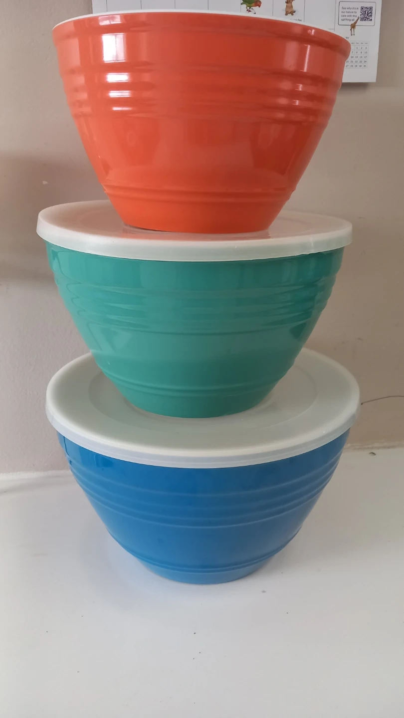 This set includes three mixing bowls in vibrant blue, teal, and orange. They're made of durable material and come with white lids for convenient storage. Great for prep work or storing leftovers!