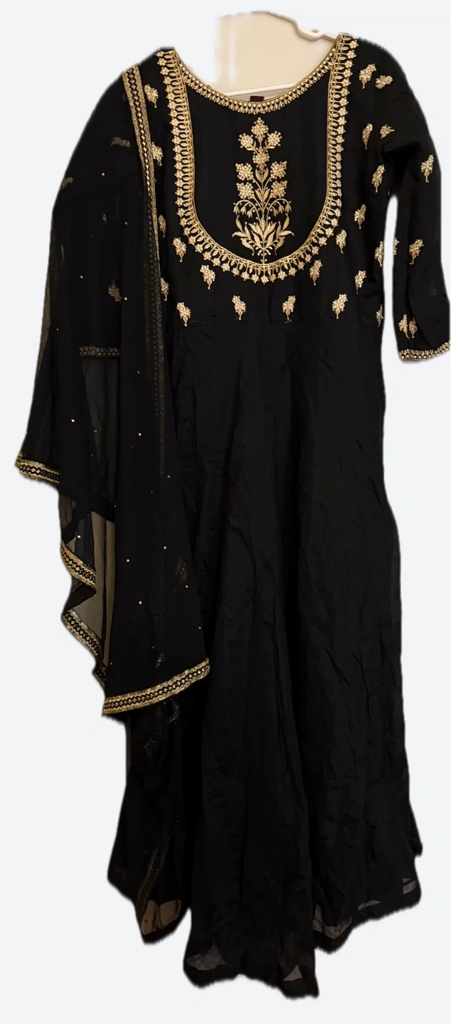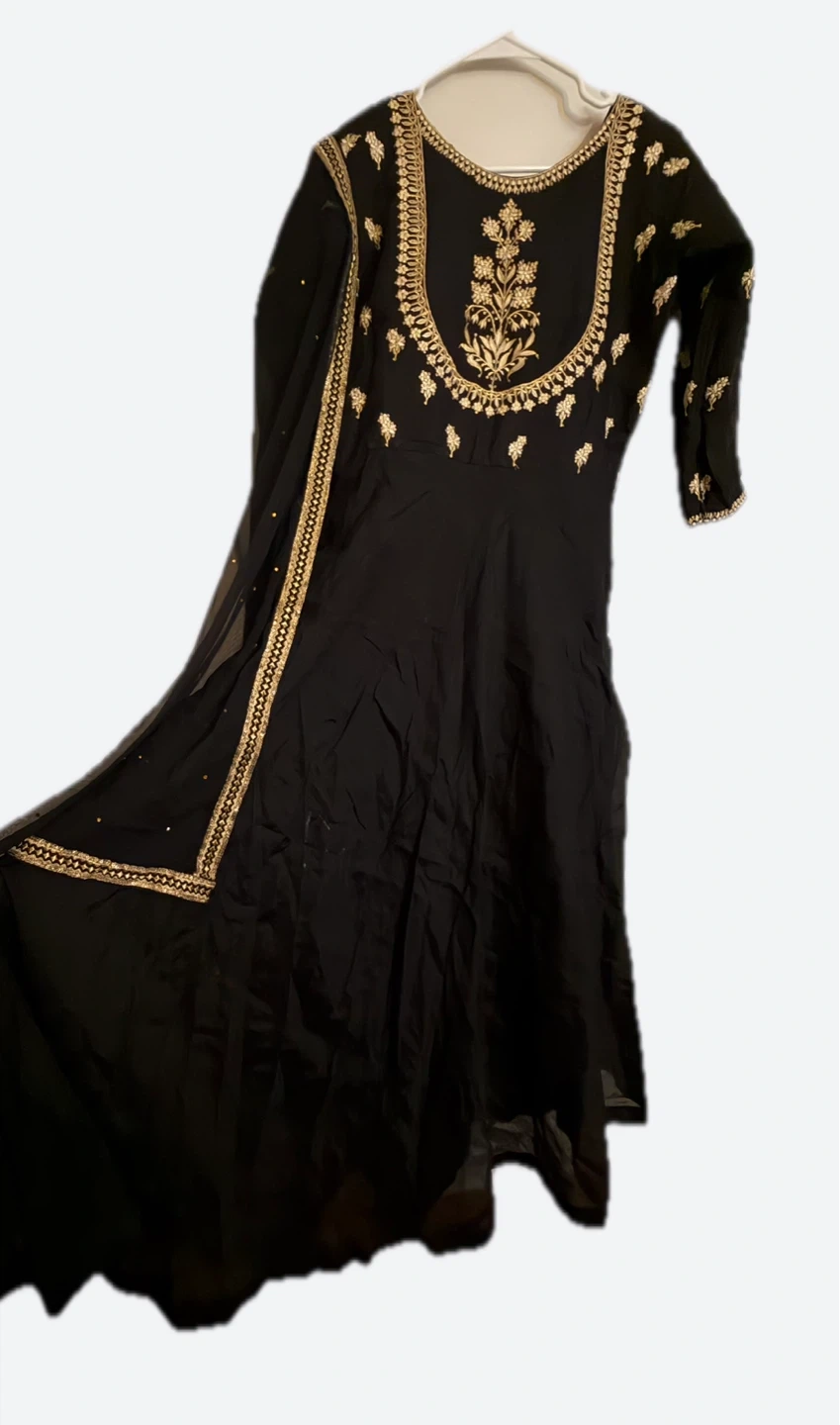 This is a black Anarkali suit set, featuring intricate gold embroidery on the neckline and sleeves. It comes with a matching dupatta. The fabric looks like a flowy georgette or similar material. This outfit is great for special occasions.