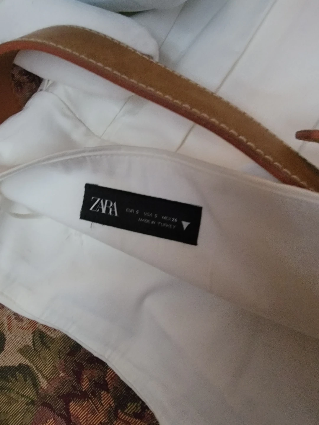 This is a ZARA white pleated mini skirt. It features a brown faux leather belt with a buckle closure. The skirt is made in Turkey. It's a size S, with EUR S, USA S, and MEX 26 sizing indicated. This skirt is perfect for casual wear or can be dressed up for a more polished look!