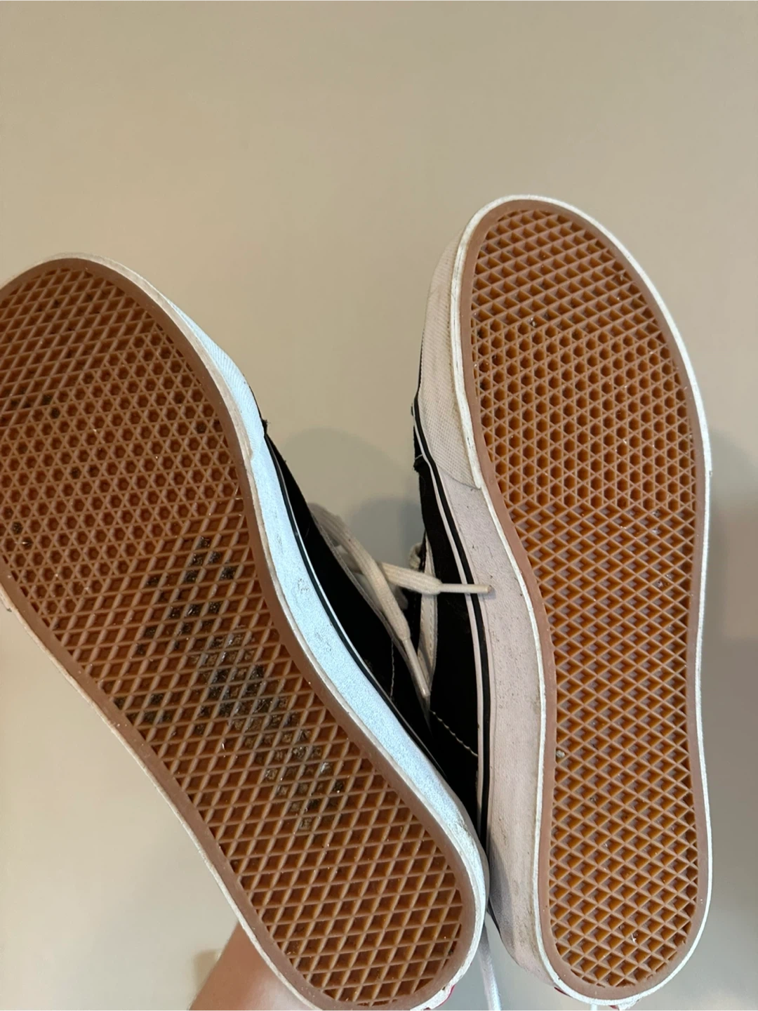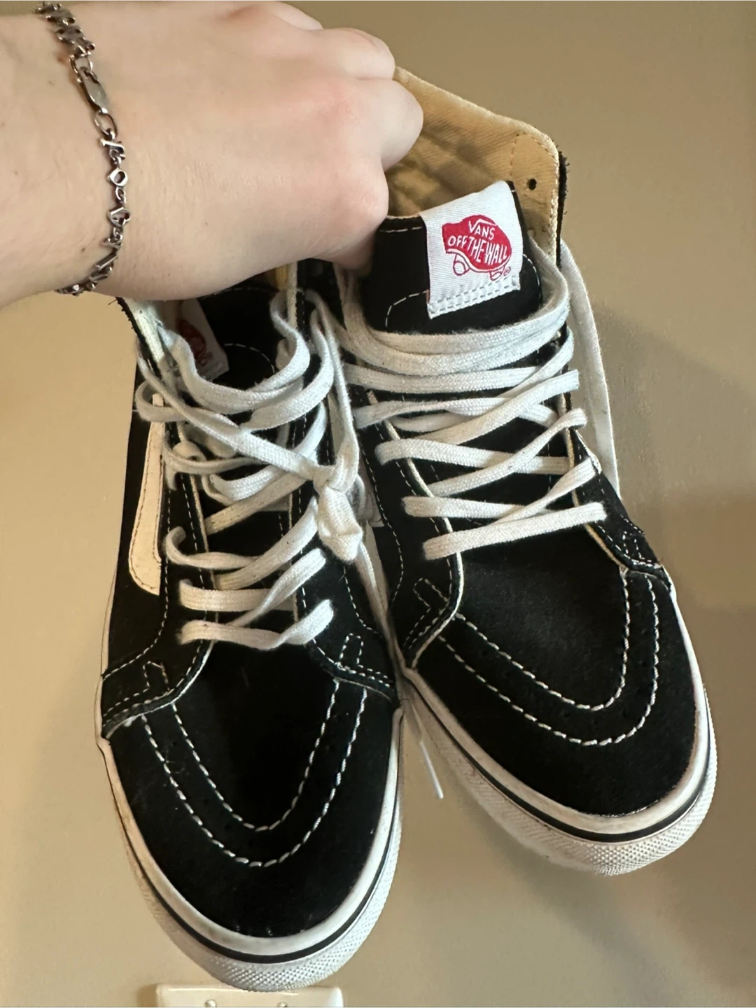 Classic black and white Vans Sk8-Hi high-top sneakers. Suede and canvas upper. These shoes are known for their durable construction and iconic style. Great for everyday wear! Great used condition. Cash only, pick up downtown only.