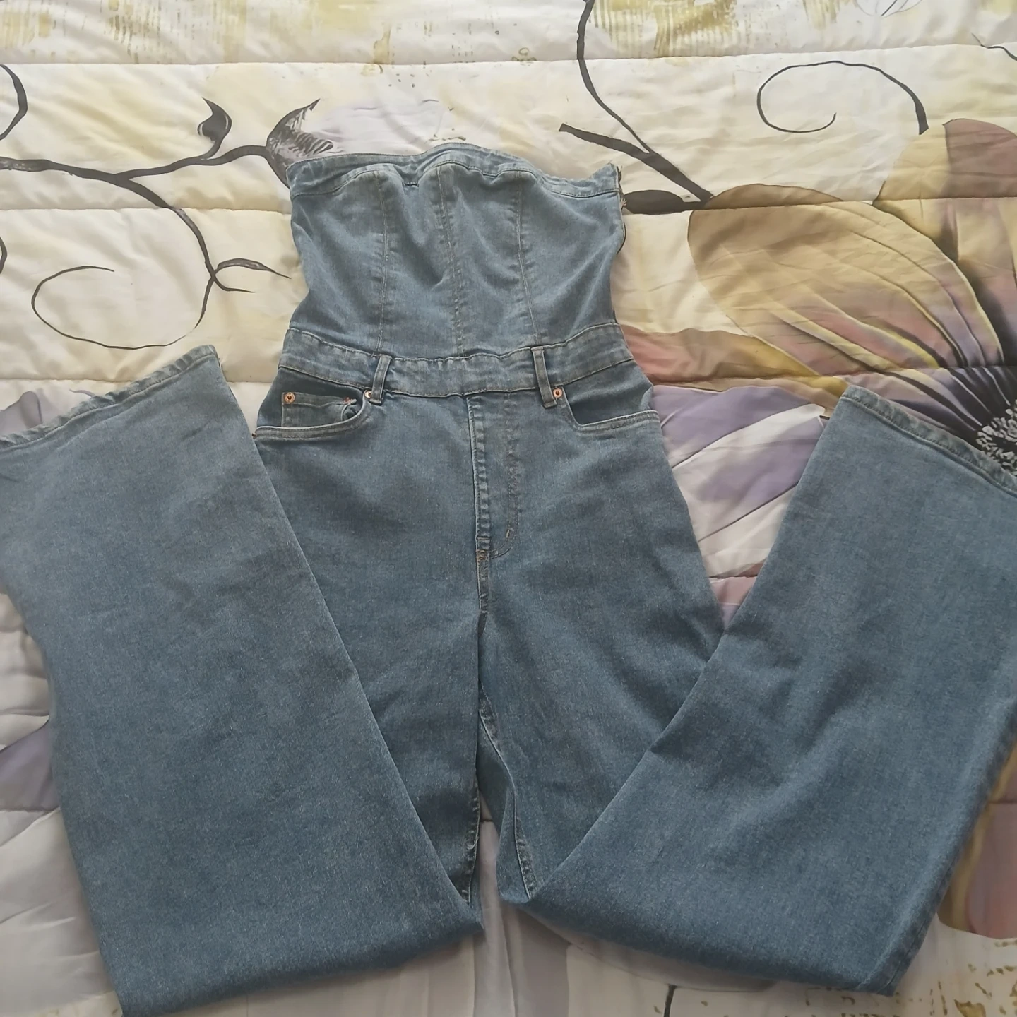 This is a light wash denim strapless jumpsuit. It features a fitted bodice with a flared leg. Elasticized waist at the back for comfort.