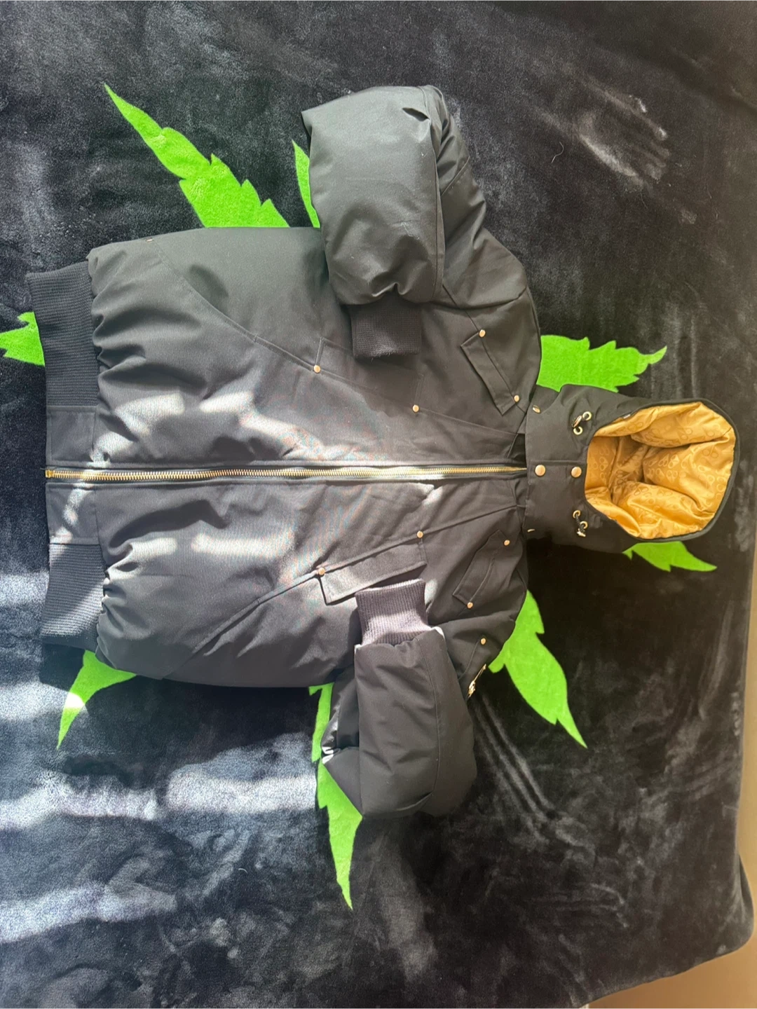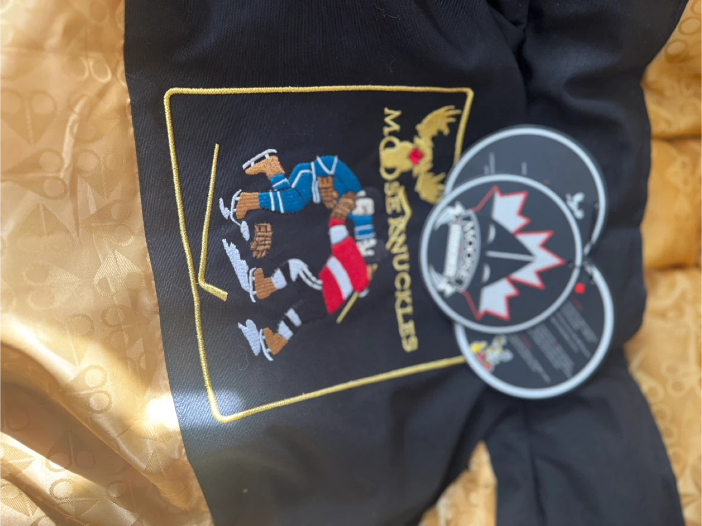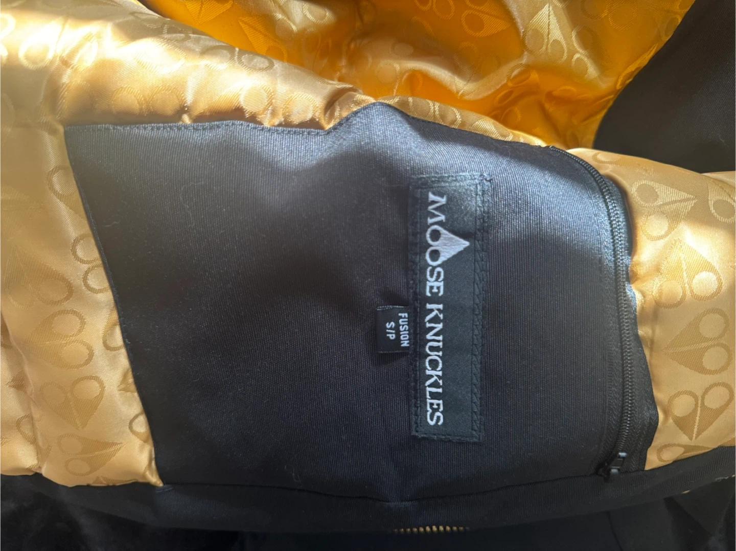 This is a black Moose Knuckles Fusion bomber jacket with a gold lining. It's a size S/P. The jacket comes with a Moose Knuckles storage bag. It features embroidered hockey players on the back.