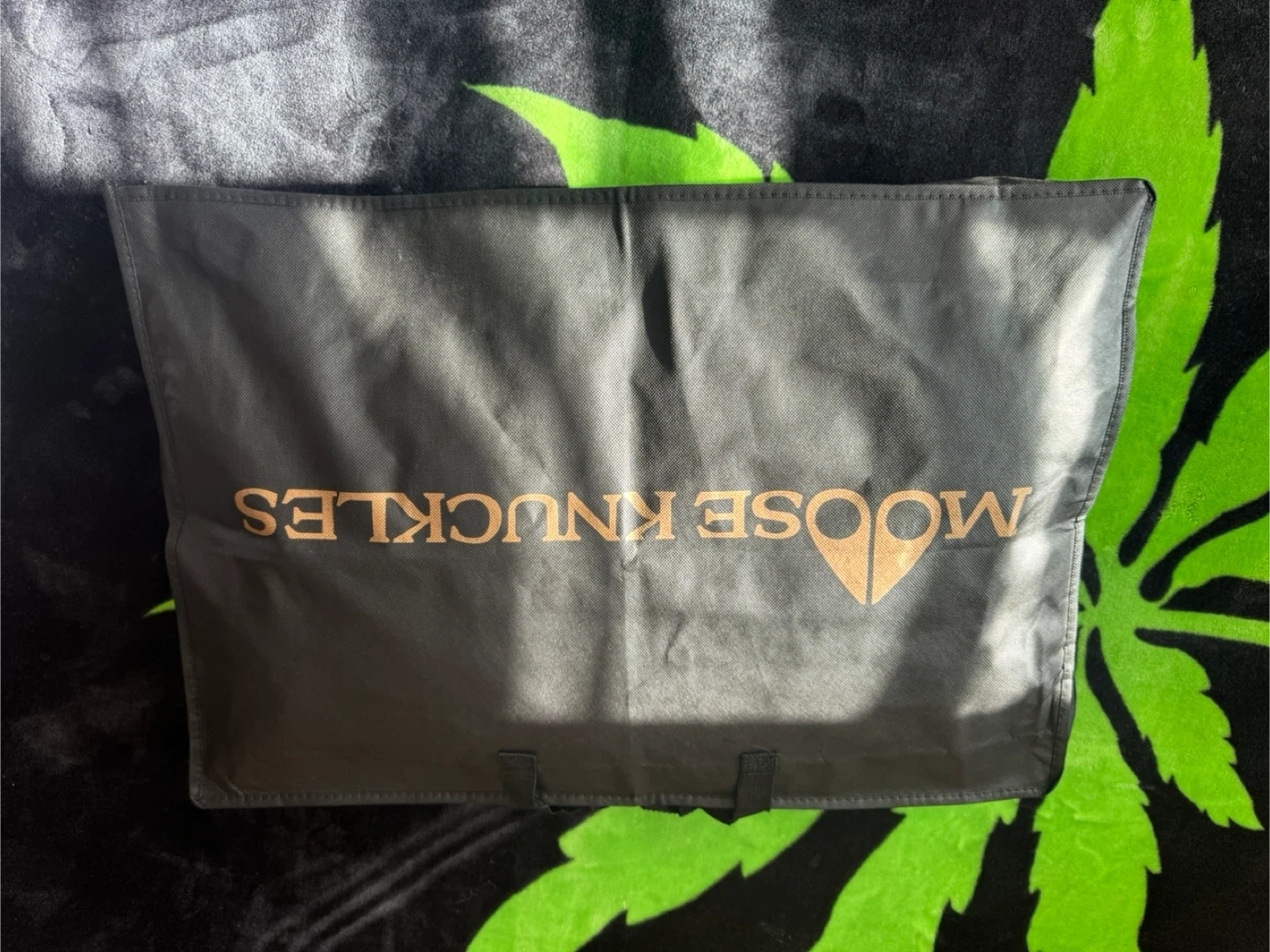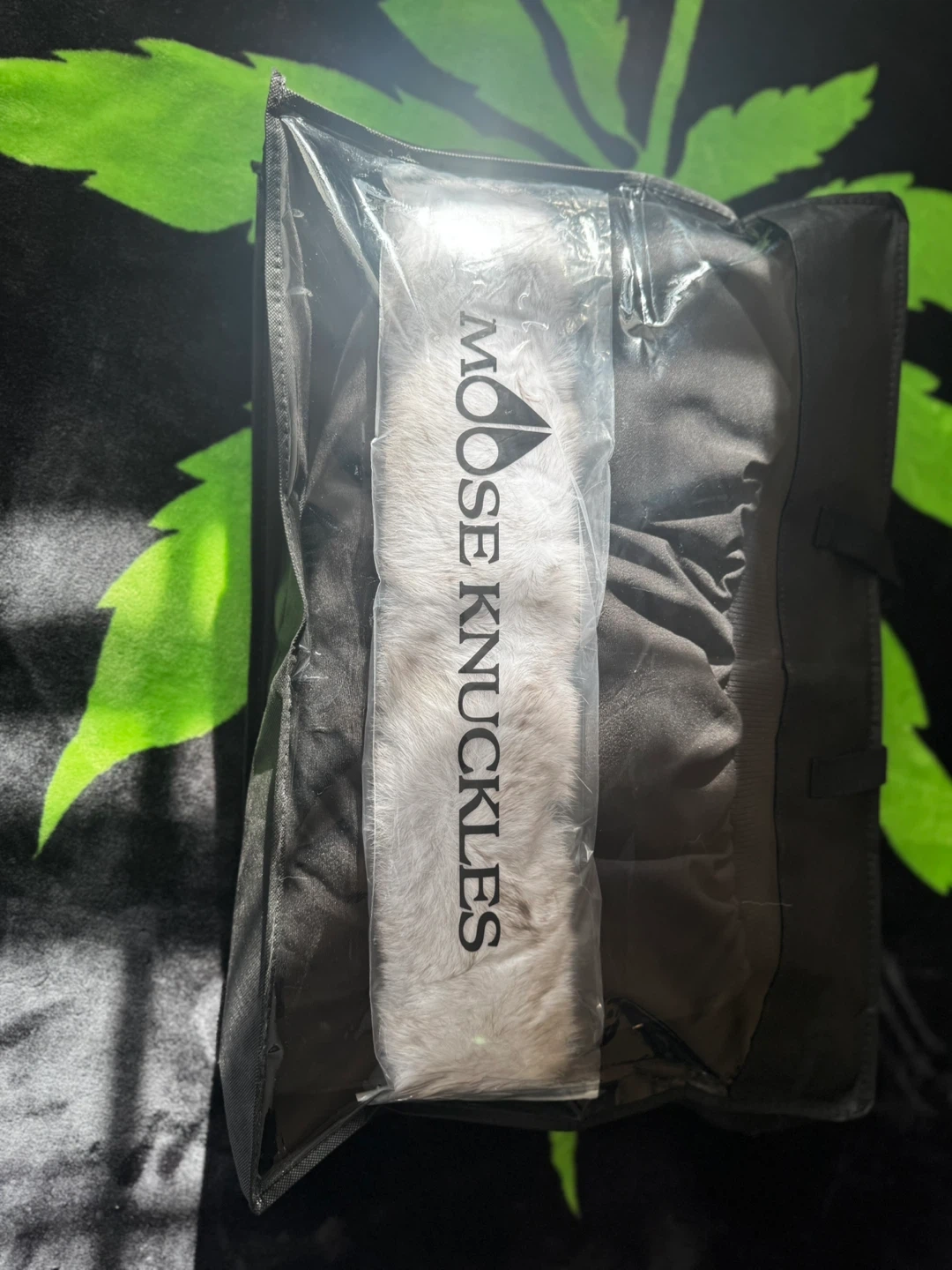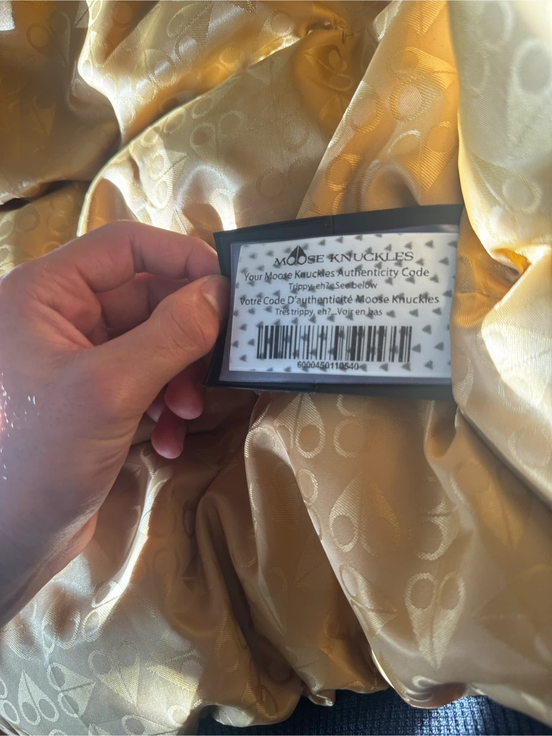 This is a black Moose Knuckles Fusion bomber jacket with a gold lining. It's a size S/P. The jacket comes with a Moose Knuckles storage bag. It features embroidered hockey players on the back.