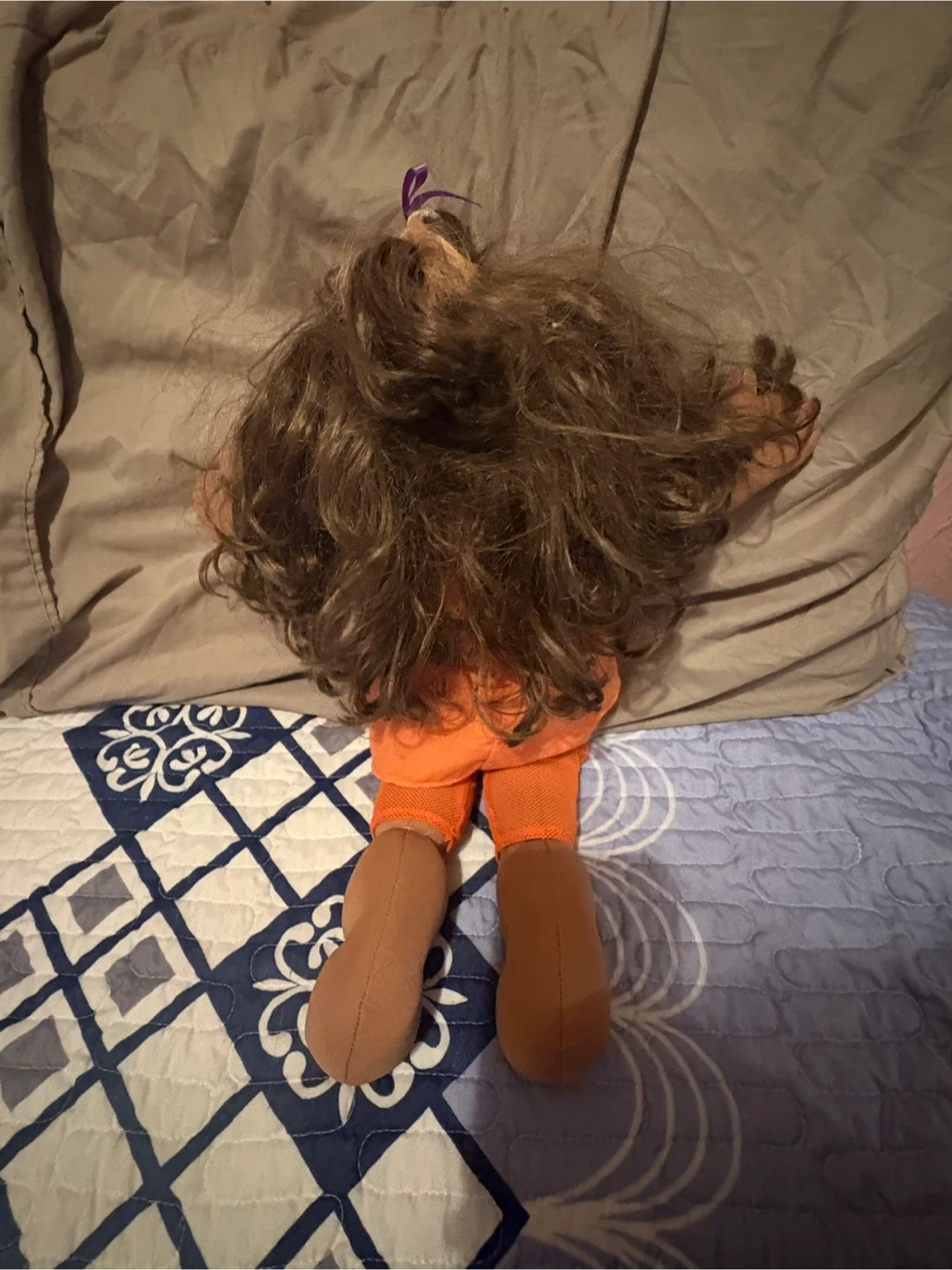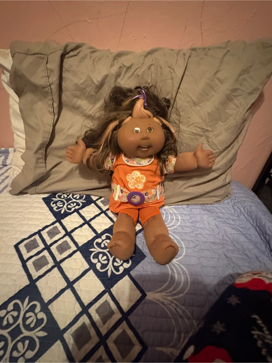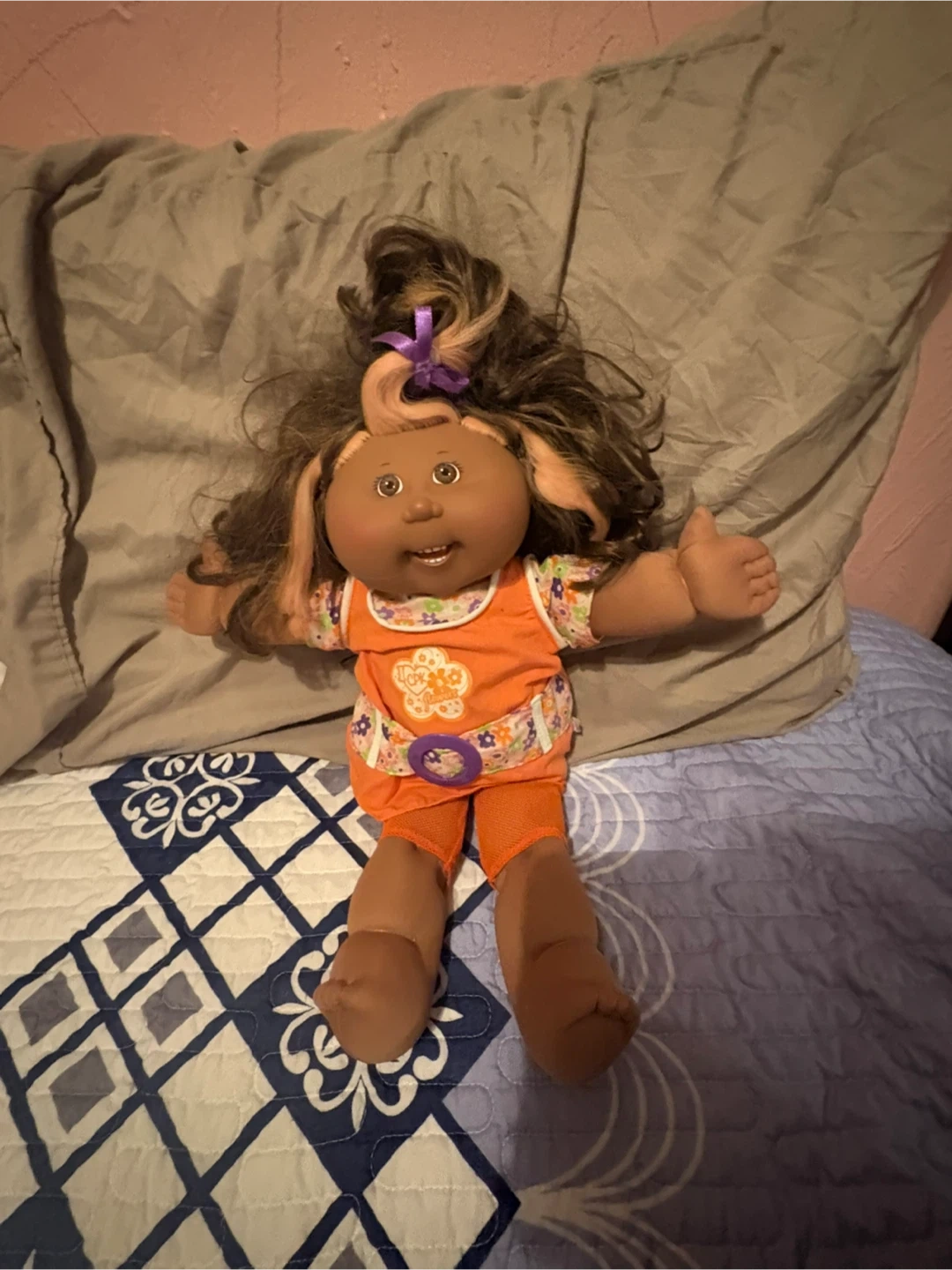 Selling a cute Cabbage Patch Kids doll! She's wearing an adorable orange outfit and has brown hair with a purple ribbon. Perfect for collectors or as a gift for a child