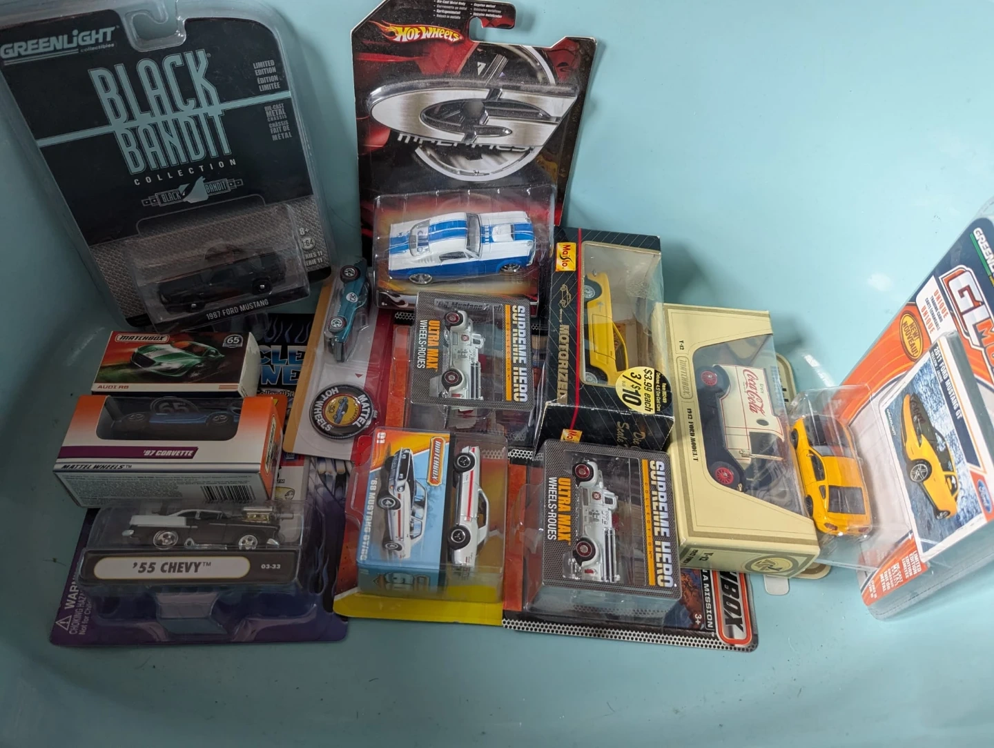 Collection of die-cast model cars including Greenlight Black Bandit, Matchbox, Hot Wheels, and Maisto. Features include a 1987 Ford Mustang, '97 Corvette, '55 Chevy, and more. Several models are in original packaging, some with special editions like "Supreme Hero" and "Ultra Max".