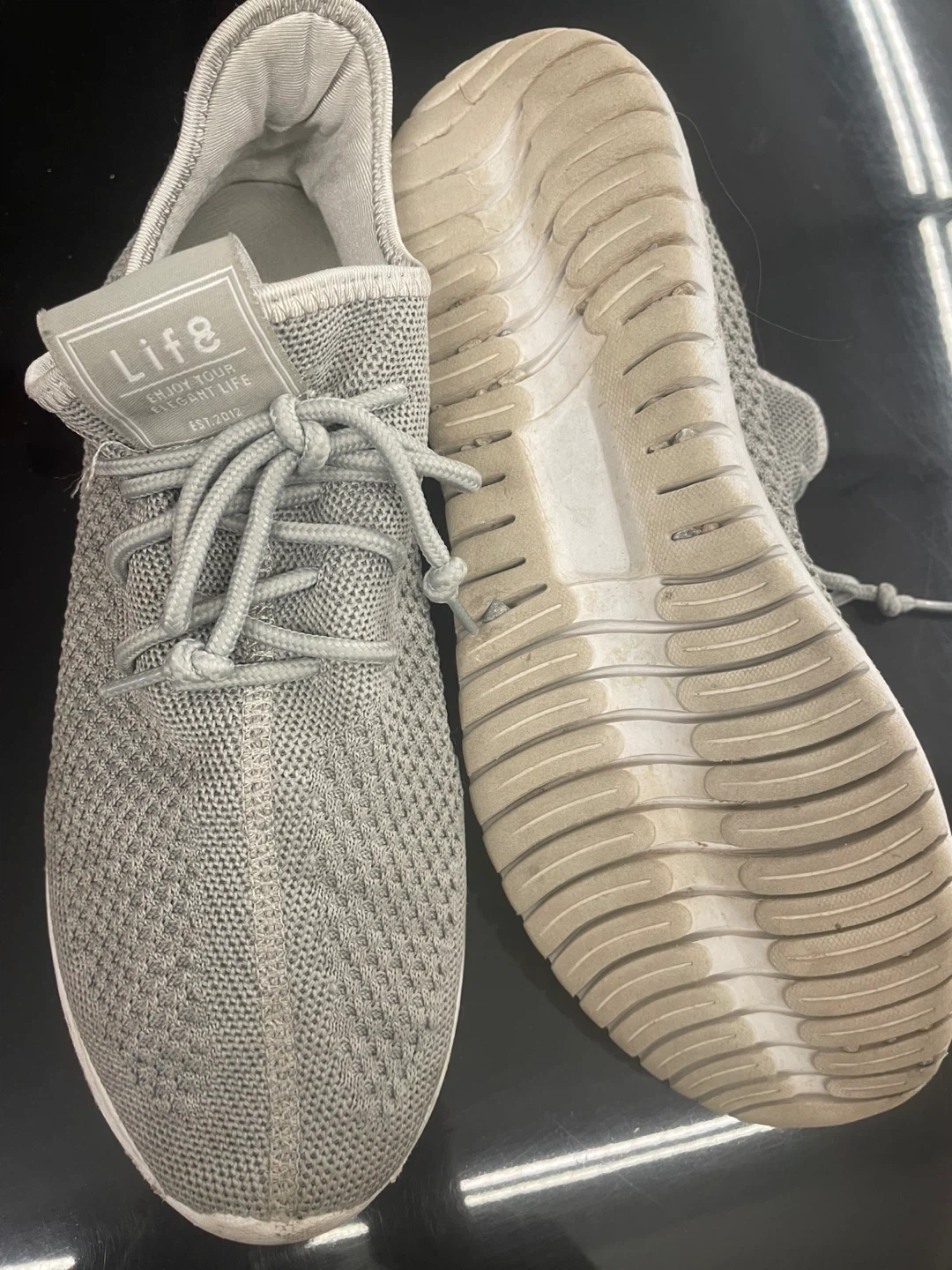 Grey knit sneakers from Life8. These shoes are made with a breathable knit upper and a flexible sole. They're designed for comfort and everyday wear. These shoes would be useful for casual outings or light athletic activities.