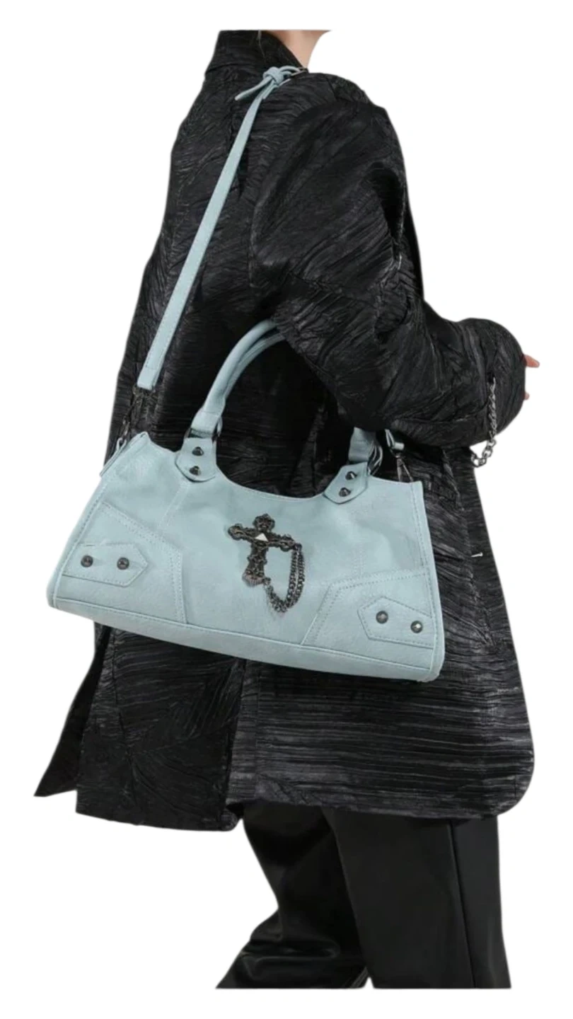 This light blue handbag features a decorative cross charm with a chain accent. It has dual top handles and an optional shoulder strap. The material appears to be faux leather.