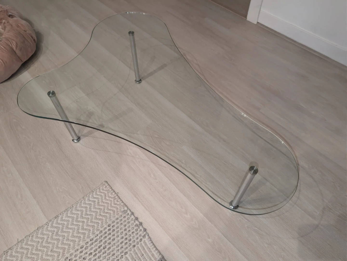 Curved glass top coffee table with metal legs. This unique table offers a modern aesthetic for your living space. It's a stylish centrepiece for any room.