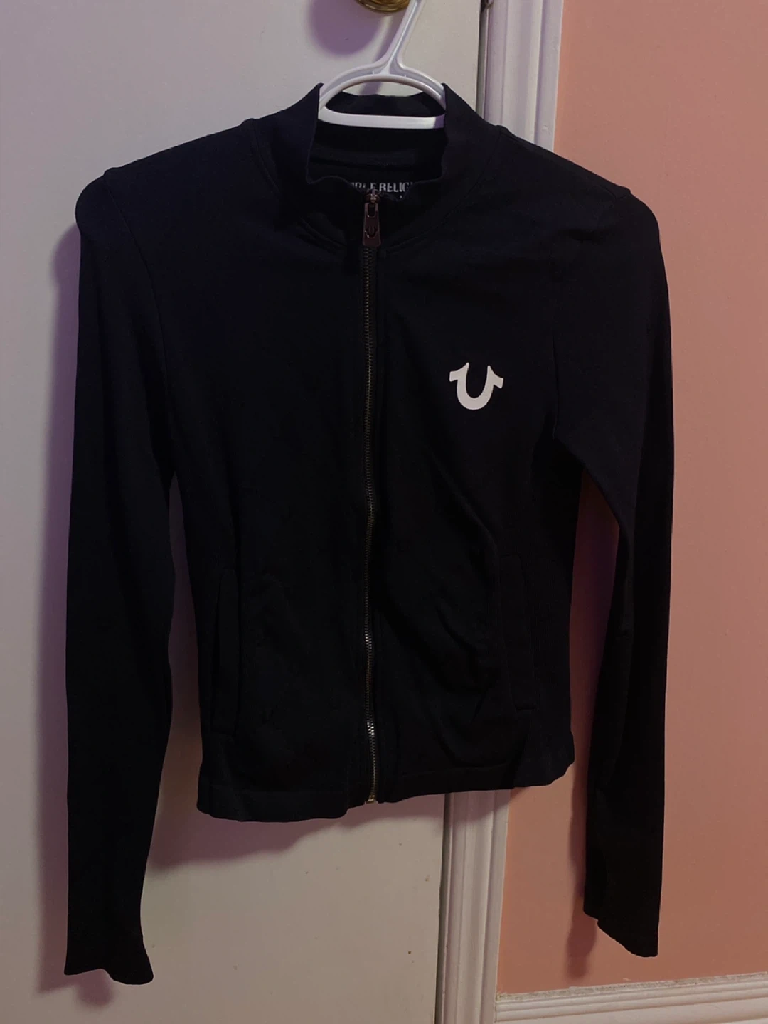 Selling a True Religion black zip-up jacket. It's in great condition and features the classic True Religion horseshoe logo. Perfect for layering or wearing on its own!