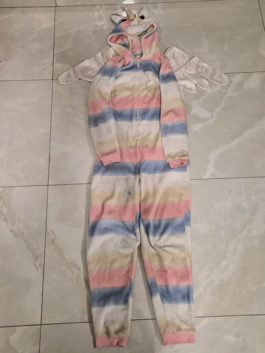 Selling a cute unicorn onesie costume! It's striped with pink, blue, and white. It has a hood with a unicorn horn and wings on the back. There are some stains on the front.