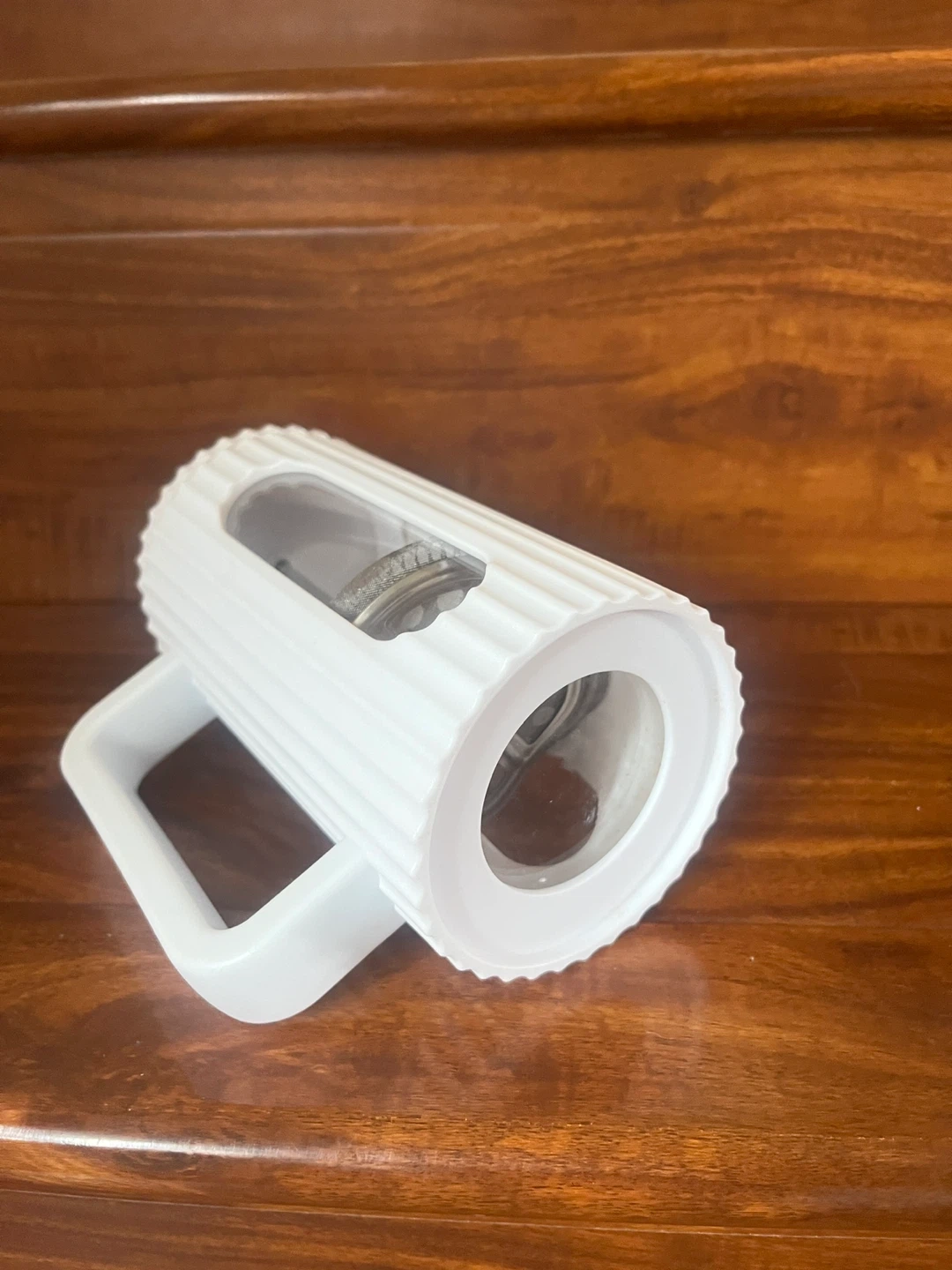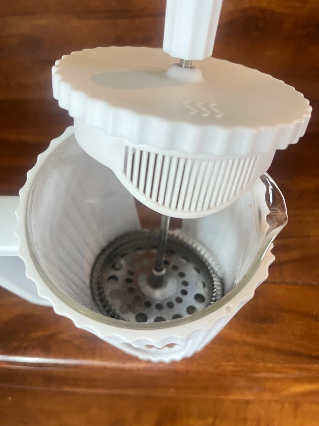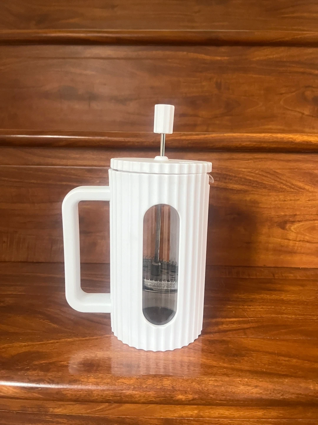 This is a white French press coffee maker. It's made with a glass carafe and a white plastic exterior with a handle. It has a plunger assembly for brewing coffee.