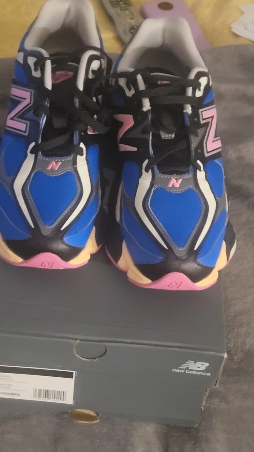 These New Balance 9060 sneakers feature a striking blue, pink, and yellow colorway. They're made with a mix of mesh and leather for a comfortable fit. The original box is included with your purchase. These are great for everyday wear!