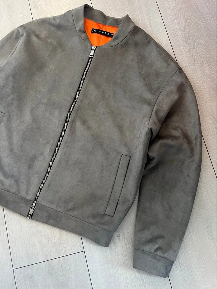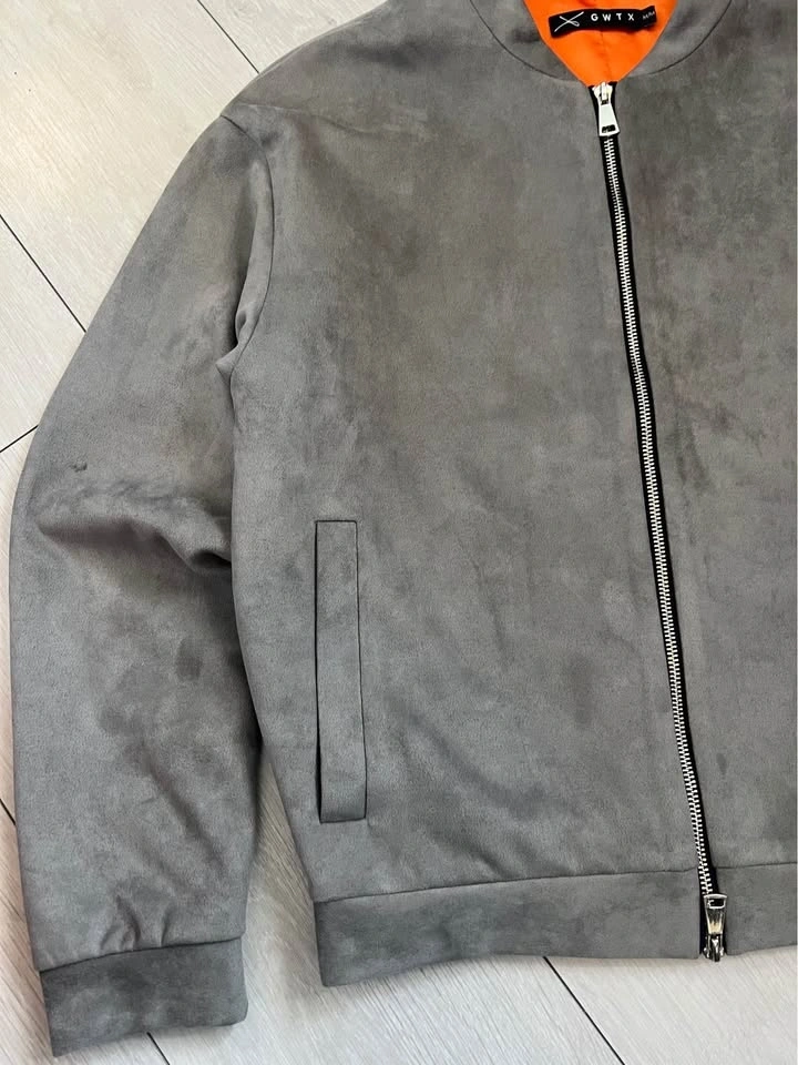 This is a GWTX jacket, a now defunct Toronto brand. It was originally purchased for $500 CAD. It features a double zipper. The jacket is labeled as a Medium but fits like a Men's Small, which is why I barely wore it as it was too tight. The exterior is a soft, short-hair suede with an orange inner lining. It's a very nice jacket, suitable for dates, the office, or casual wear. I'm sad to see it go, but it's been sitting in my closet and I can no longer fit into it. Pickup only.
