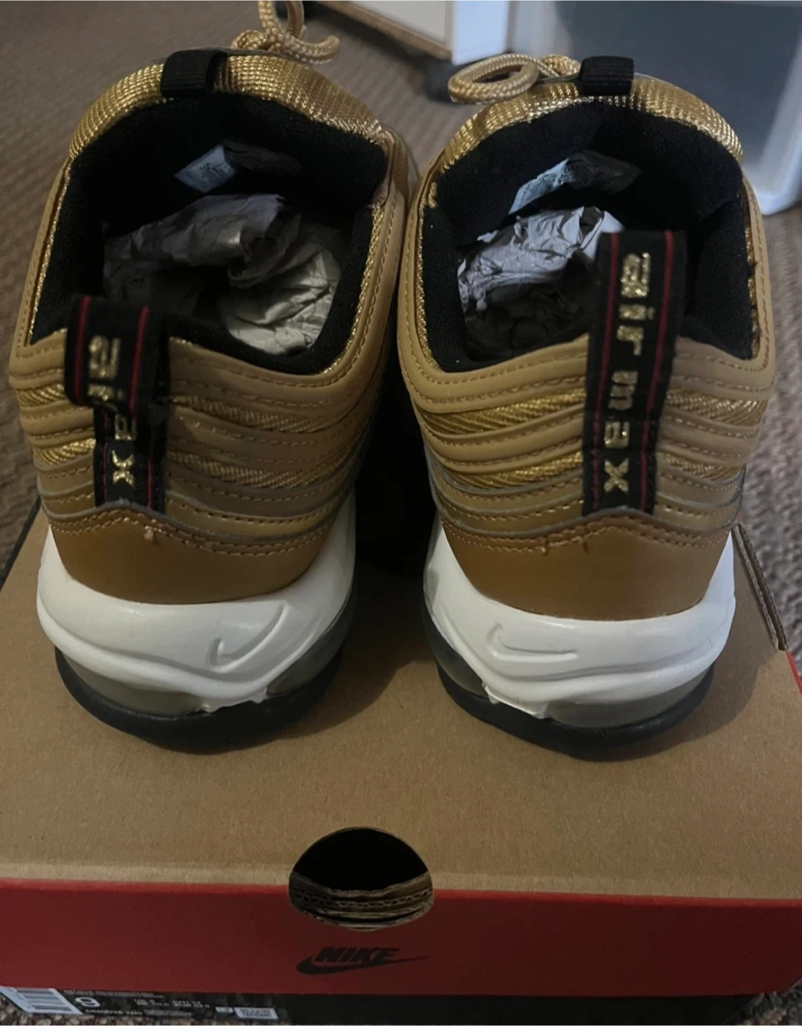 Selling a pair of Nike Air Max 97 OG sneakers in a metallic gold and varsity red colourway! They are a size 9 and come with the original box