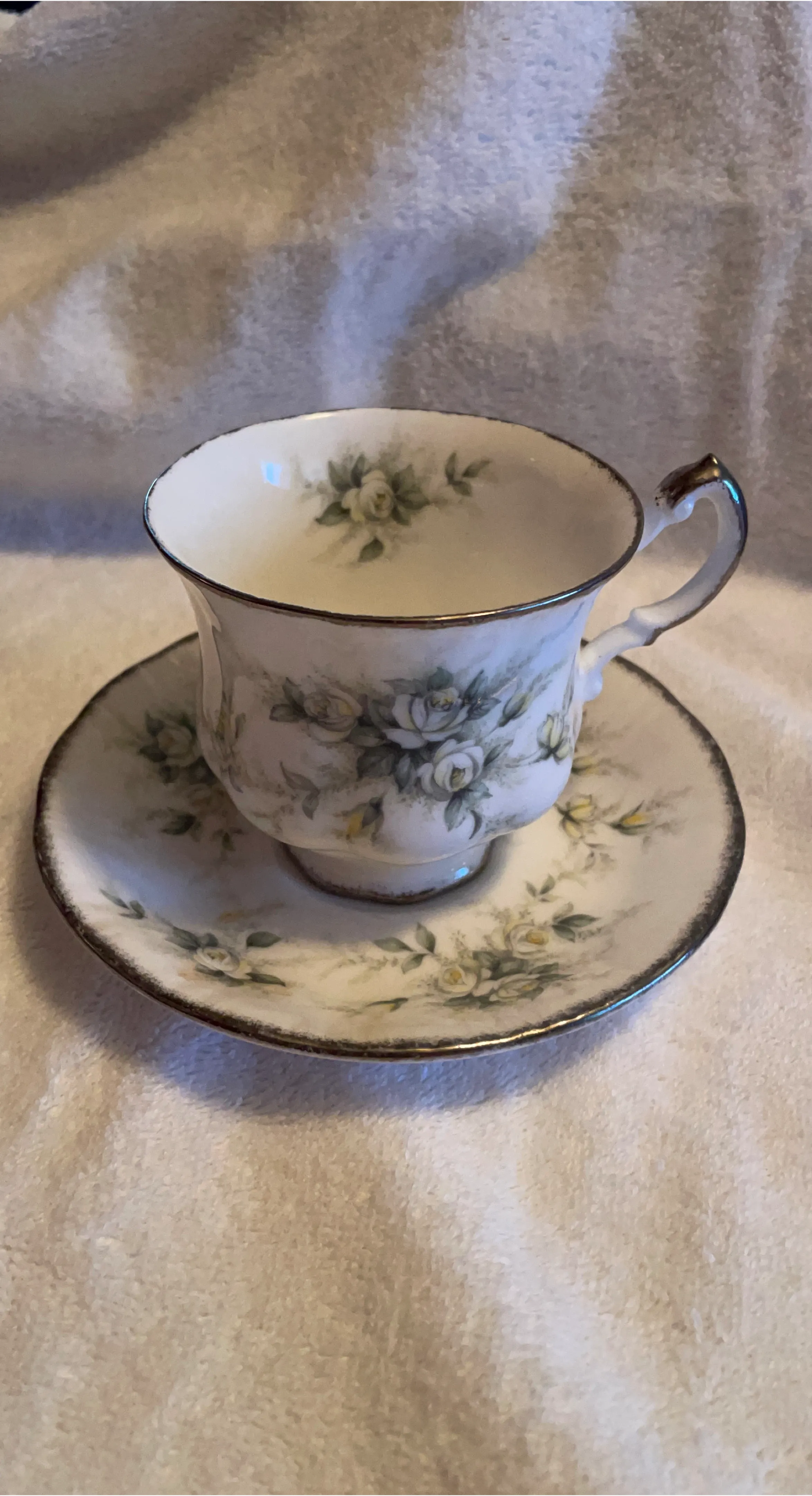 This is a Paragon "first love" teacup and saucer set. It's made in England and features a floral design with gold trim. This set is perfect for enjoying your afternoon tea!