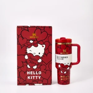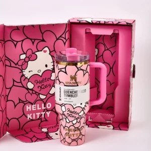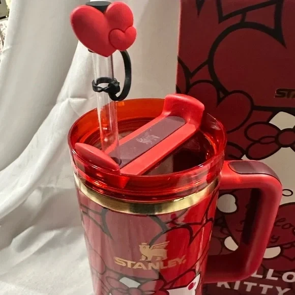 Stanley Quencher H2.0 Tumbler in collaboration with Hello Kitty. Comes with a reusable straw and straw topper. Available in pink and red colorways.