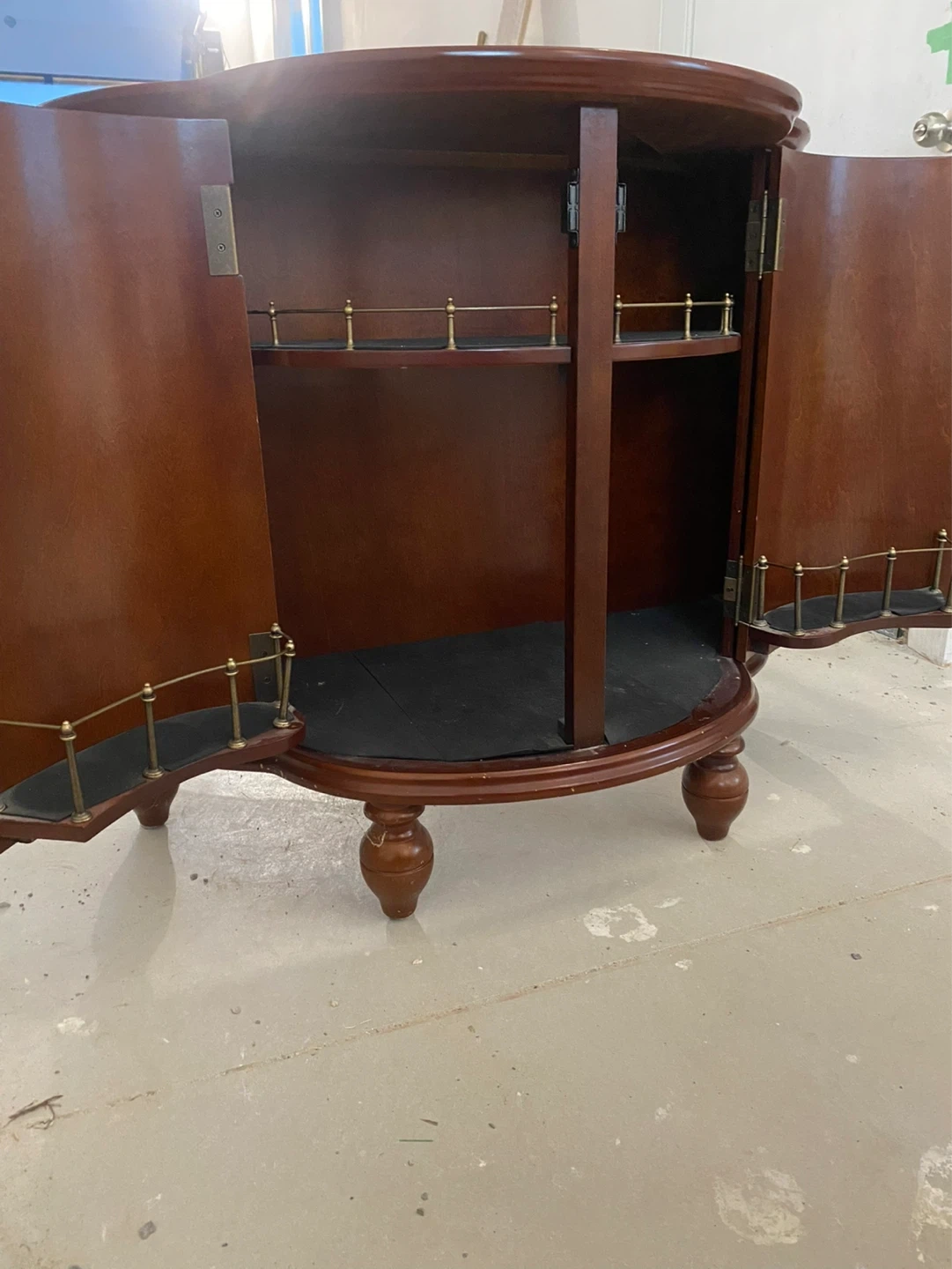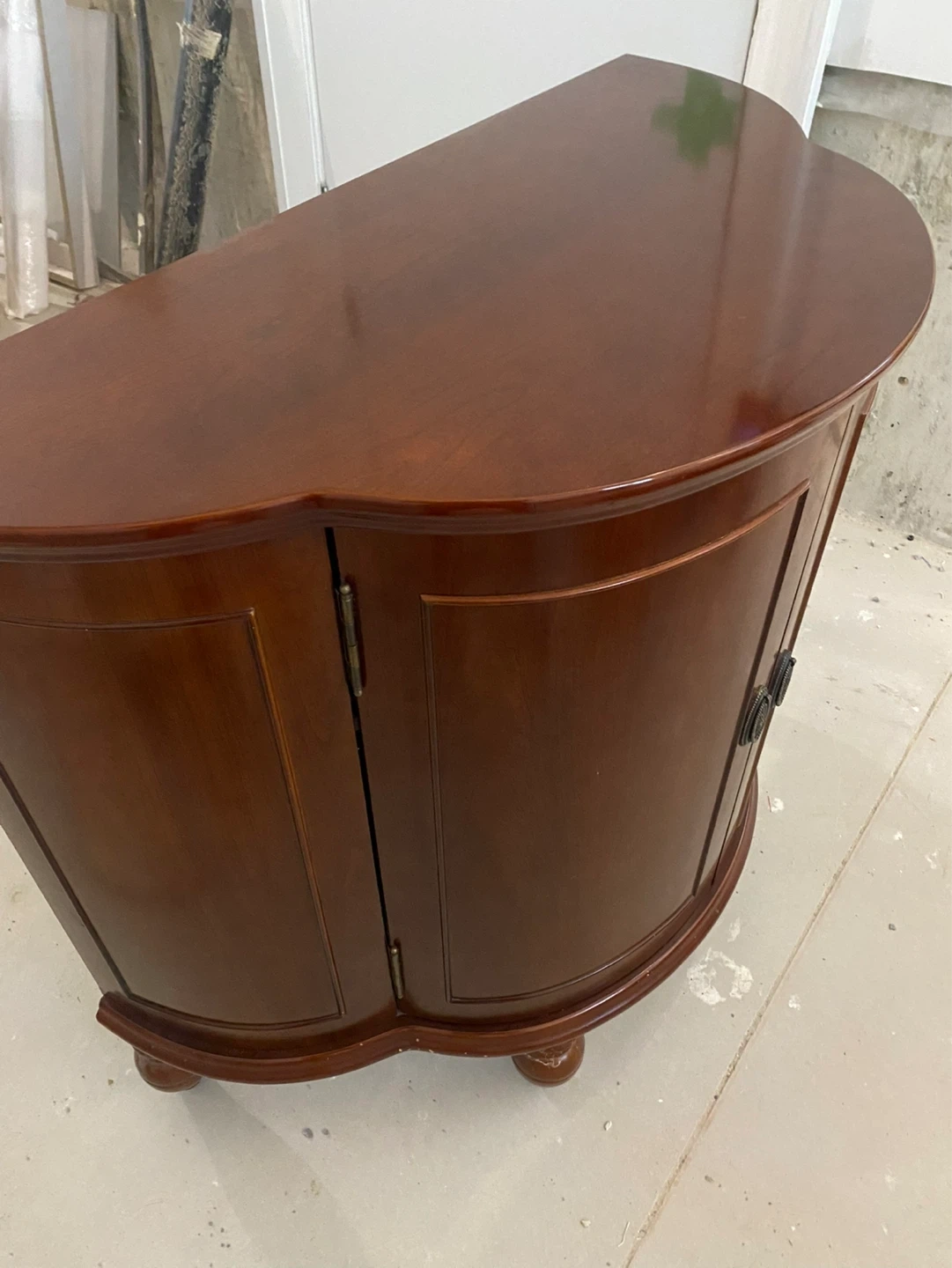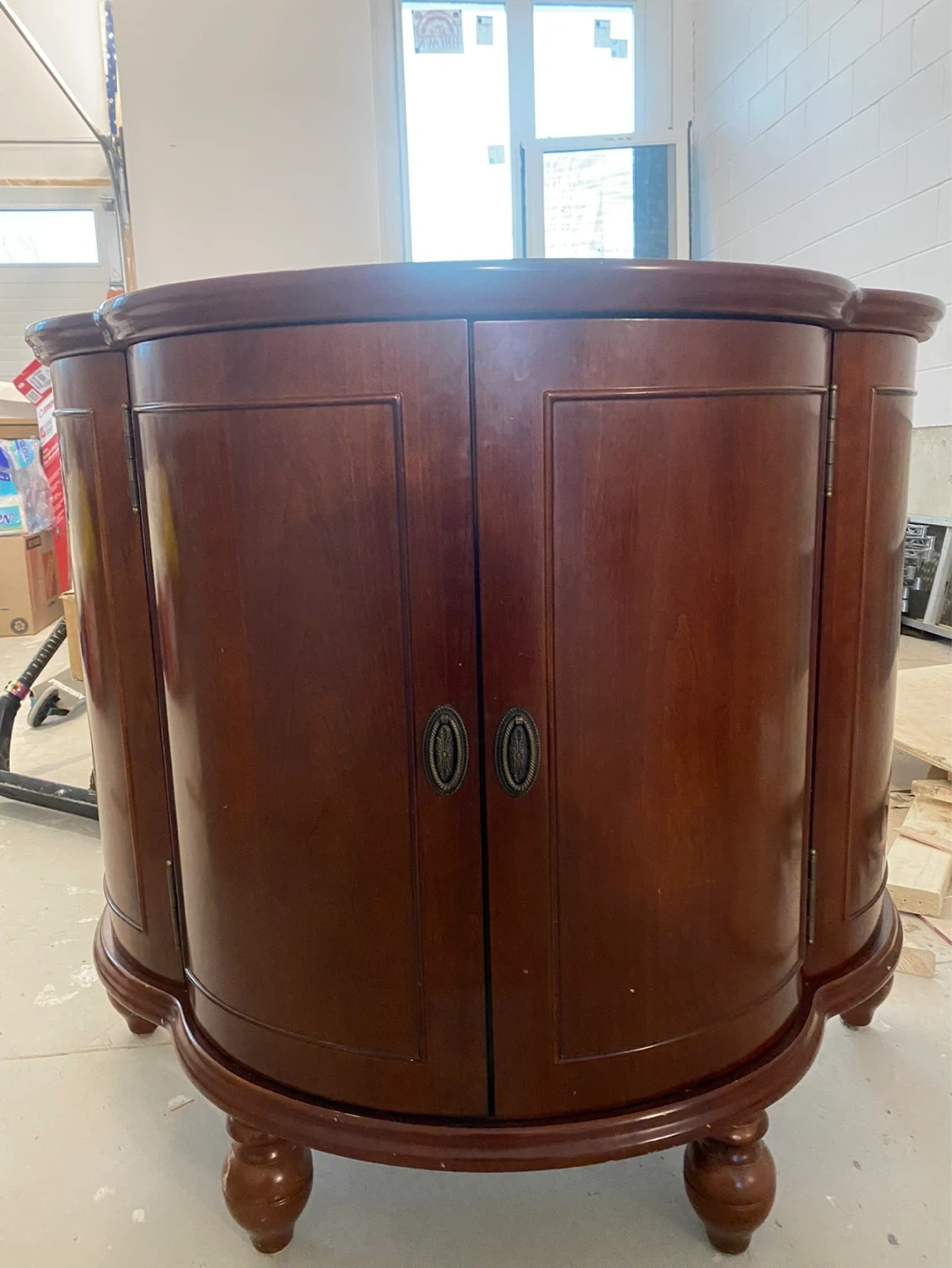 Beautiful solid wood liquor cabinet with a rich cherry finish, perfect for adding a touch of sophistication to any space. This unique piece features a curved front design and classic detailing